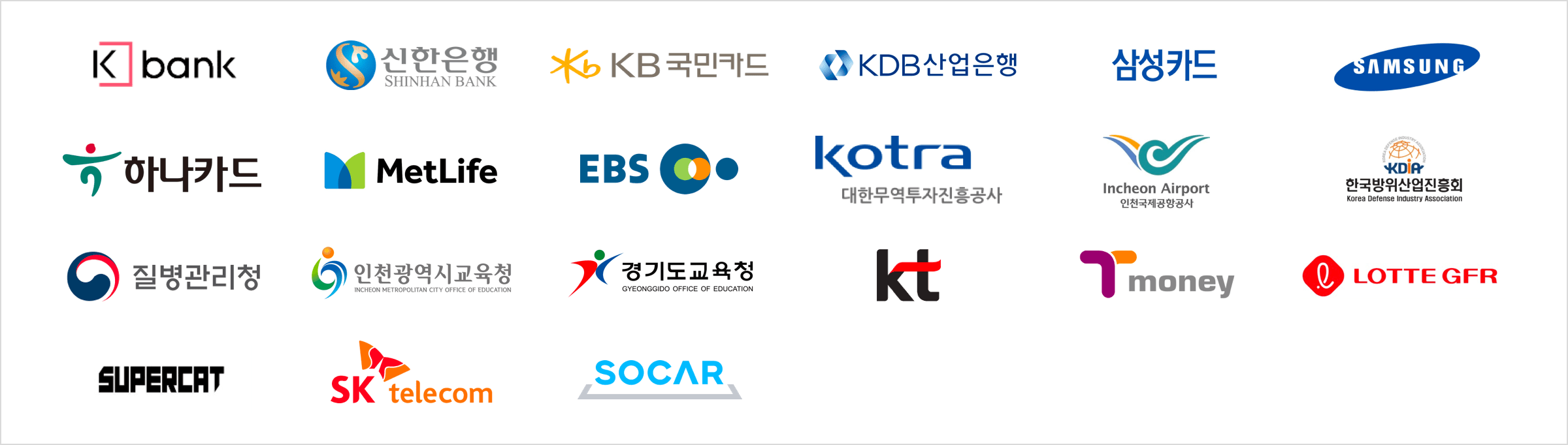 하나금융그룹, 신한은행, 삼성카드등의 금융권과 한국교육방송, 대한무역투자진행공사, 질병관리청등의 공공기관 및 KT, Sktelecom등의 엔터프라이즈에   구축 사례를 보유하고 있습니다
