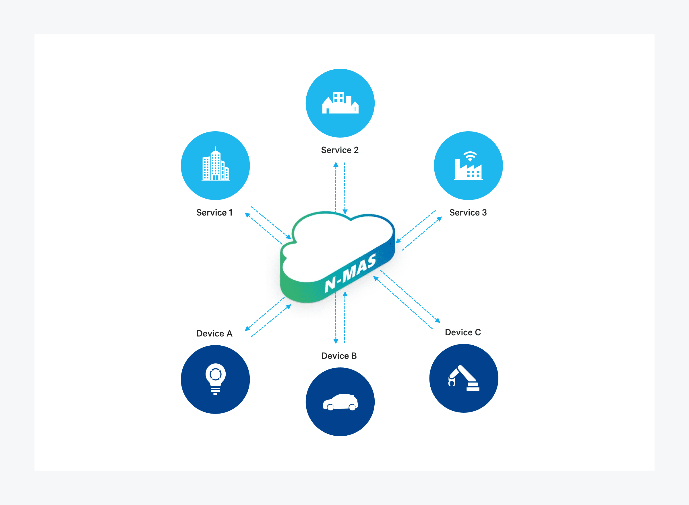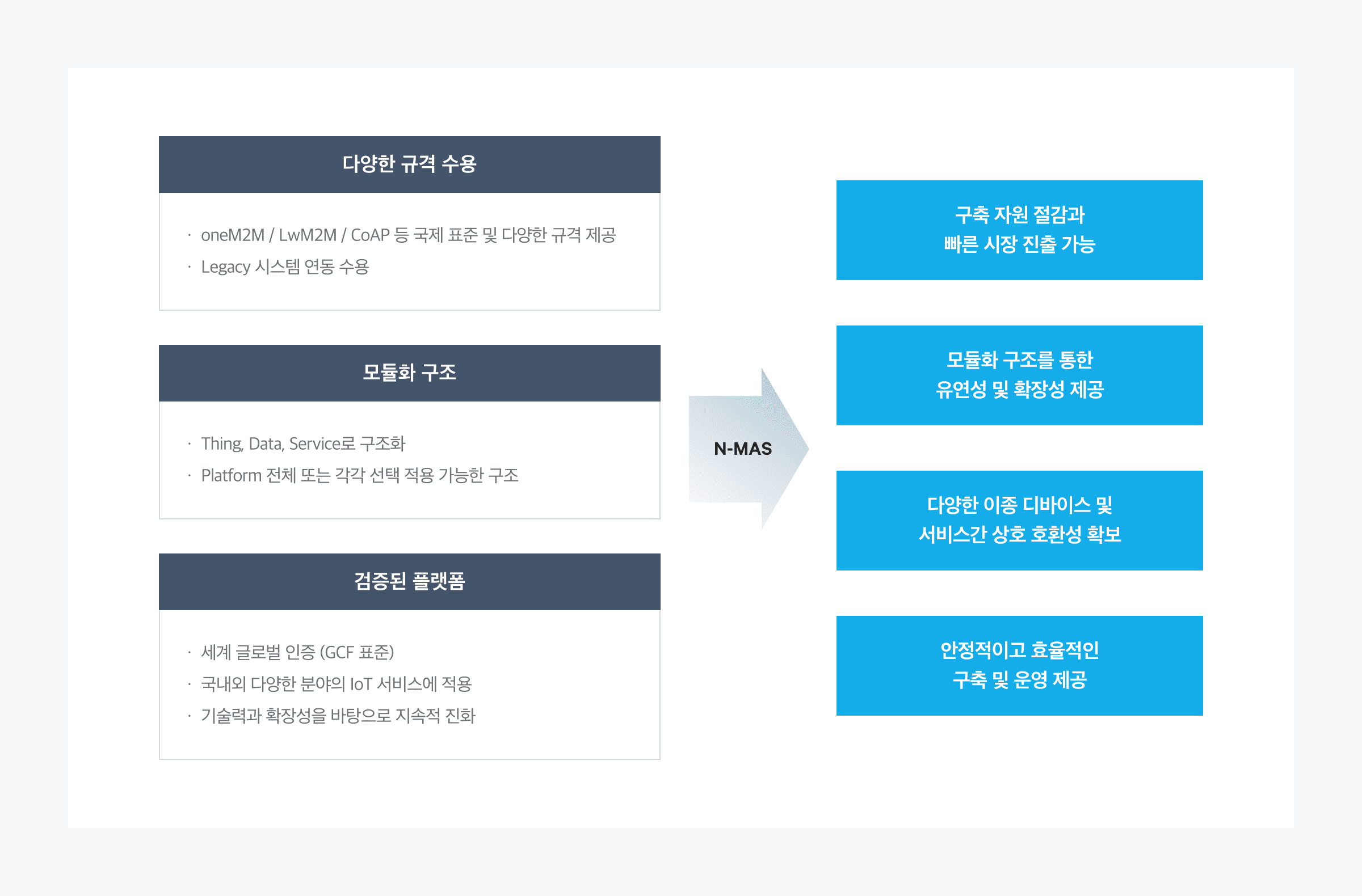 N-MAS는 시험 및 글로벌 인증 등을 통해 검증된 플랫폼이며, “디바이스관리, 데이터 수집 및 처리, 서비스 구현 도구 제공”의 3가지 Key Functions를 통해 안정적이고 효율적인 서비스 제공이 가능합니다.