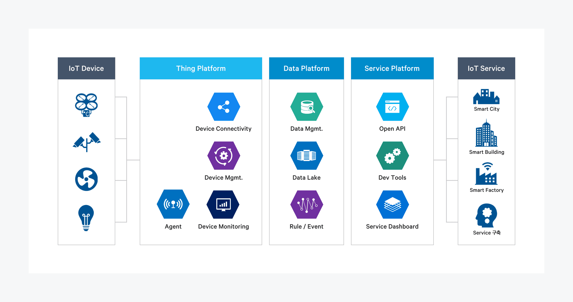 Thing, Data, Service로 IoT 비즈니스를 구현하기 위한 기능으로 구성되며, 3가지 영역을 전체 또는 부분 적용이 가능한 구조로 제공하고 있습니다. 이는 서비스 확장성 제공을 위한 용이한 구조이며, 탄력적인 구조를 바탕으로 최적의 비즈니스 환경을 제공합니다.