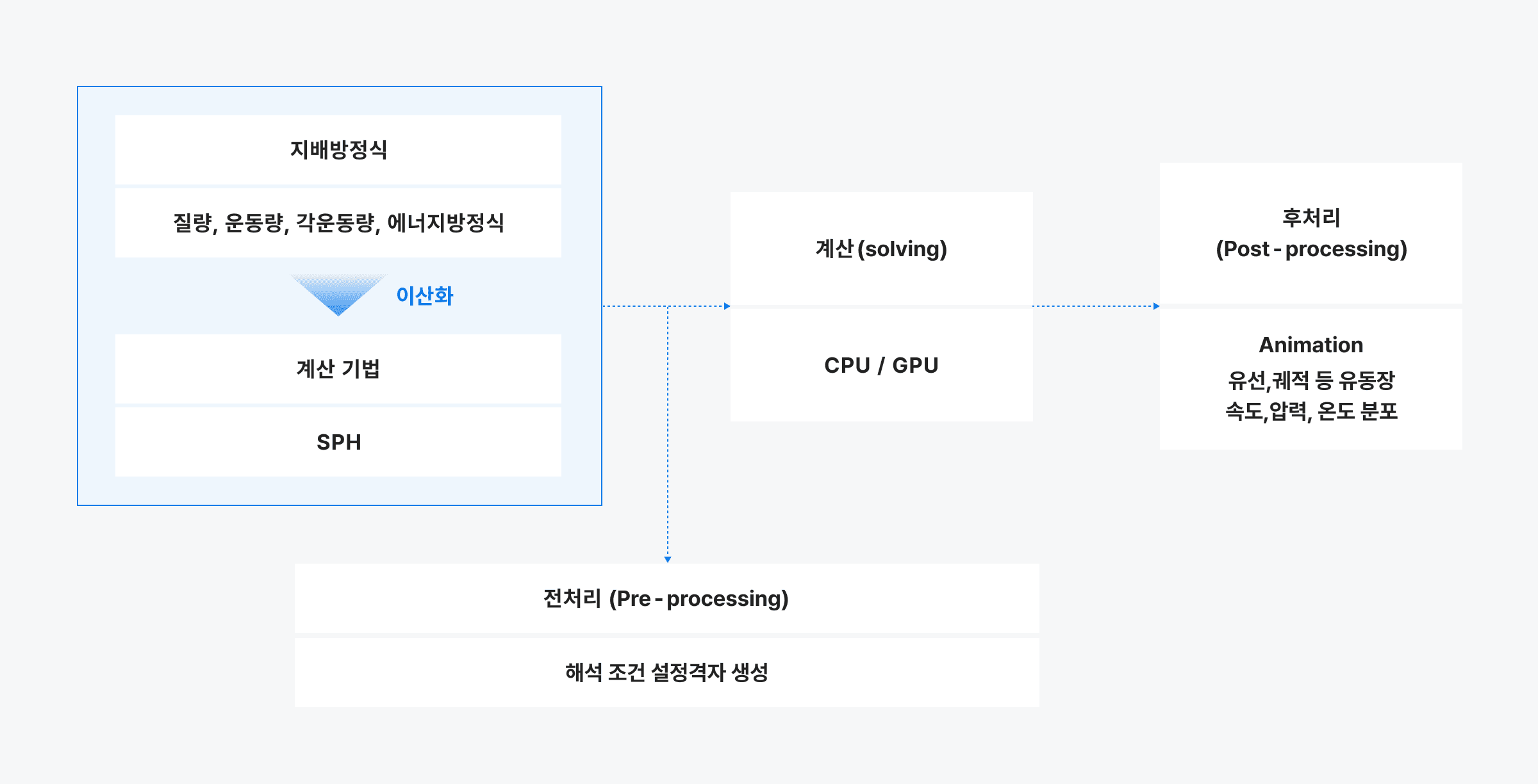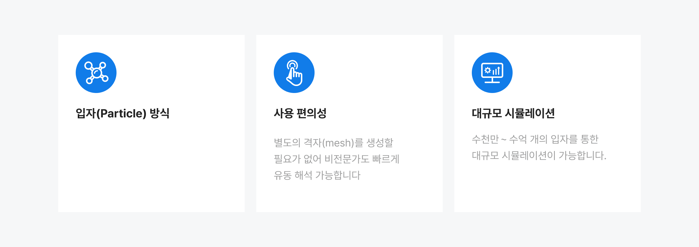 사용자 편의성을 고려한 시뮬레이션 통합 패키지(Pre/Post + Solver)로 구성되어 있으며, 입자 해석 방식에 최적화된 전용 전/후처리 UI/UX 인터페이스를 제공합니다.
