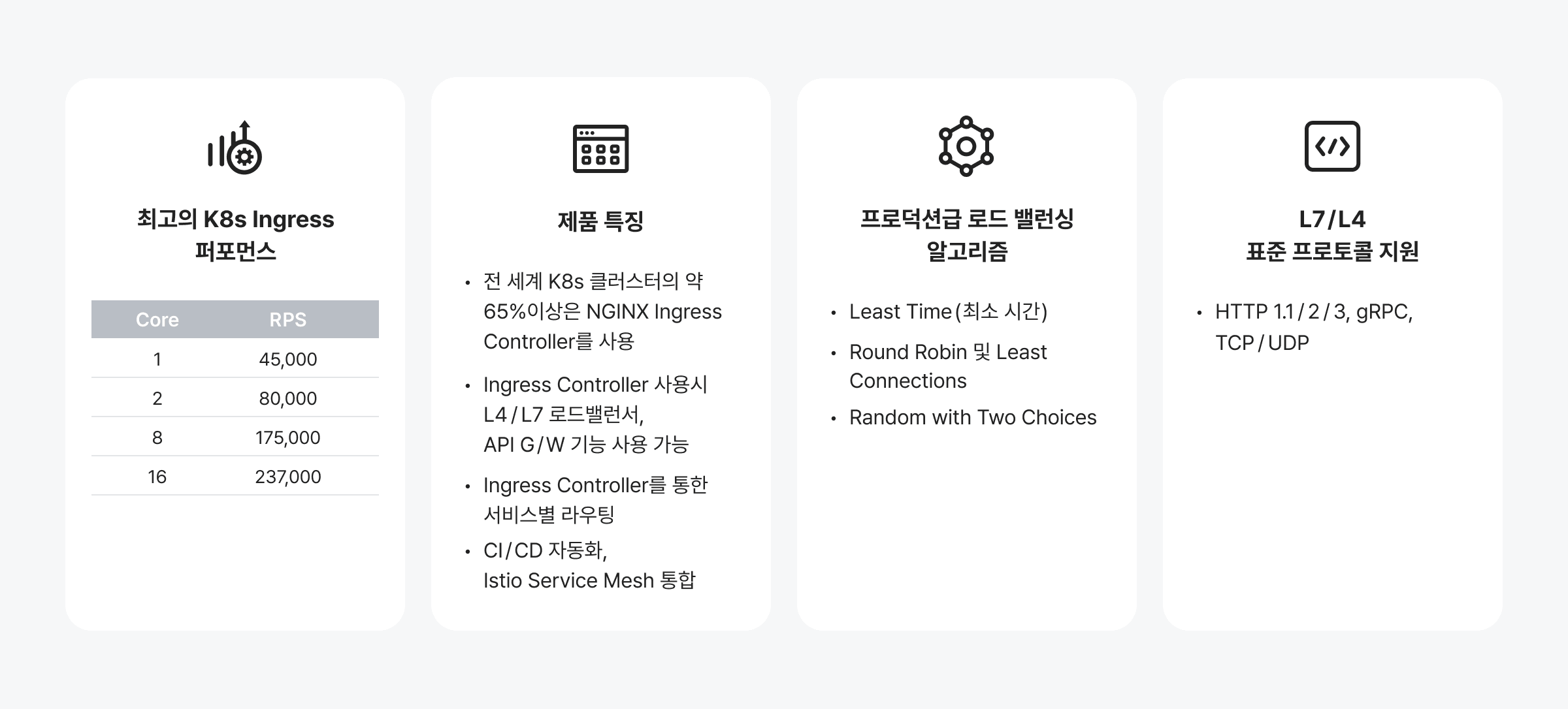 NGINX Plus Kubernetes Ingress Controller는 쿠버네티스 환경에서 고성능 L4/L7 로드 밸런싱과 보안 인증, 실시간 모니터링 기능을 제공하며, CI/CD 자동화 및 Istio Service Mesh와 통합된 최적의 쿠버네티스 환경을 지원합니다.