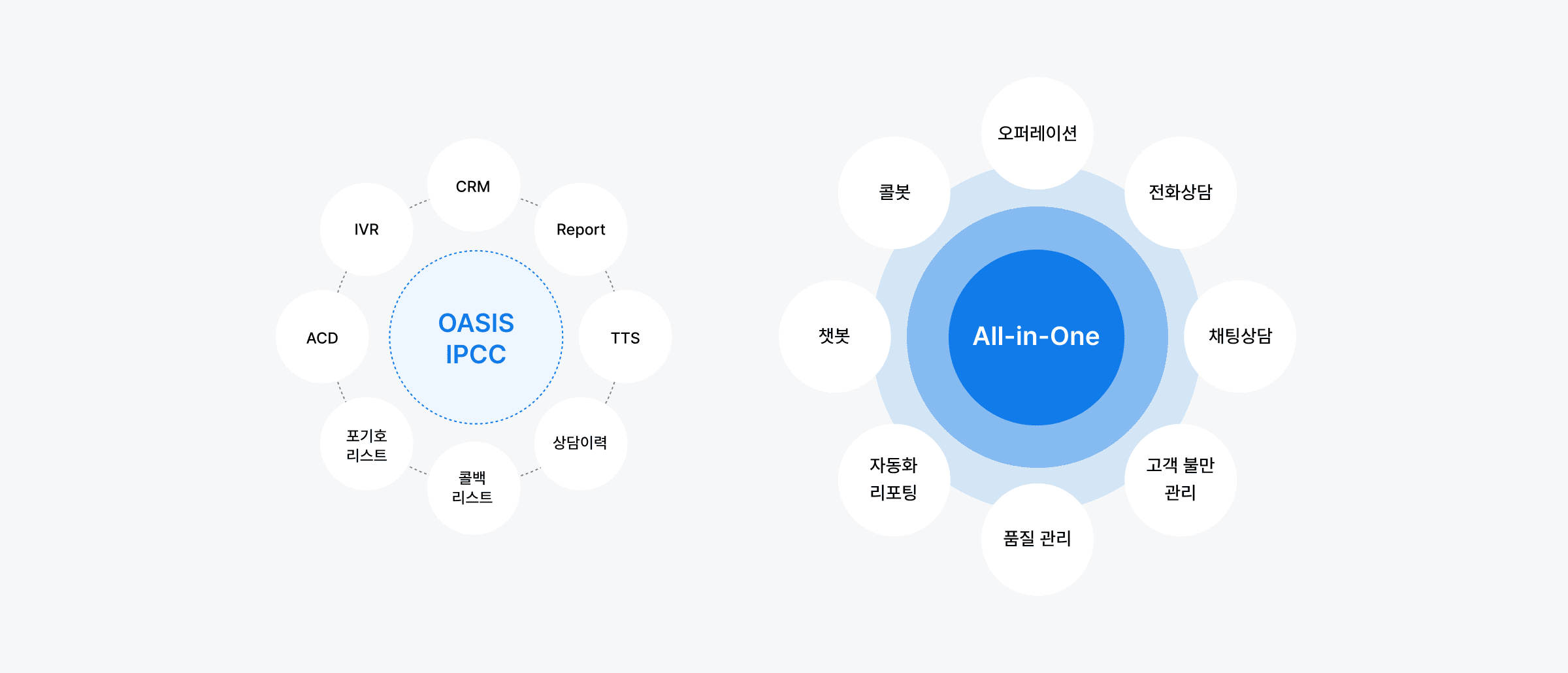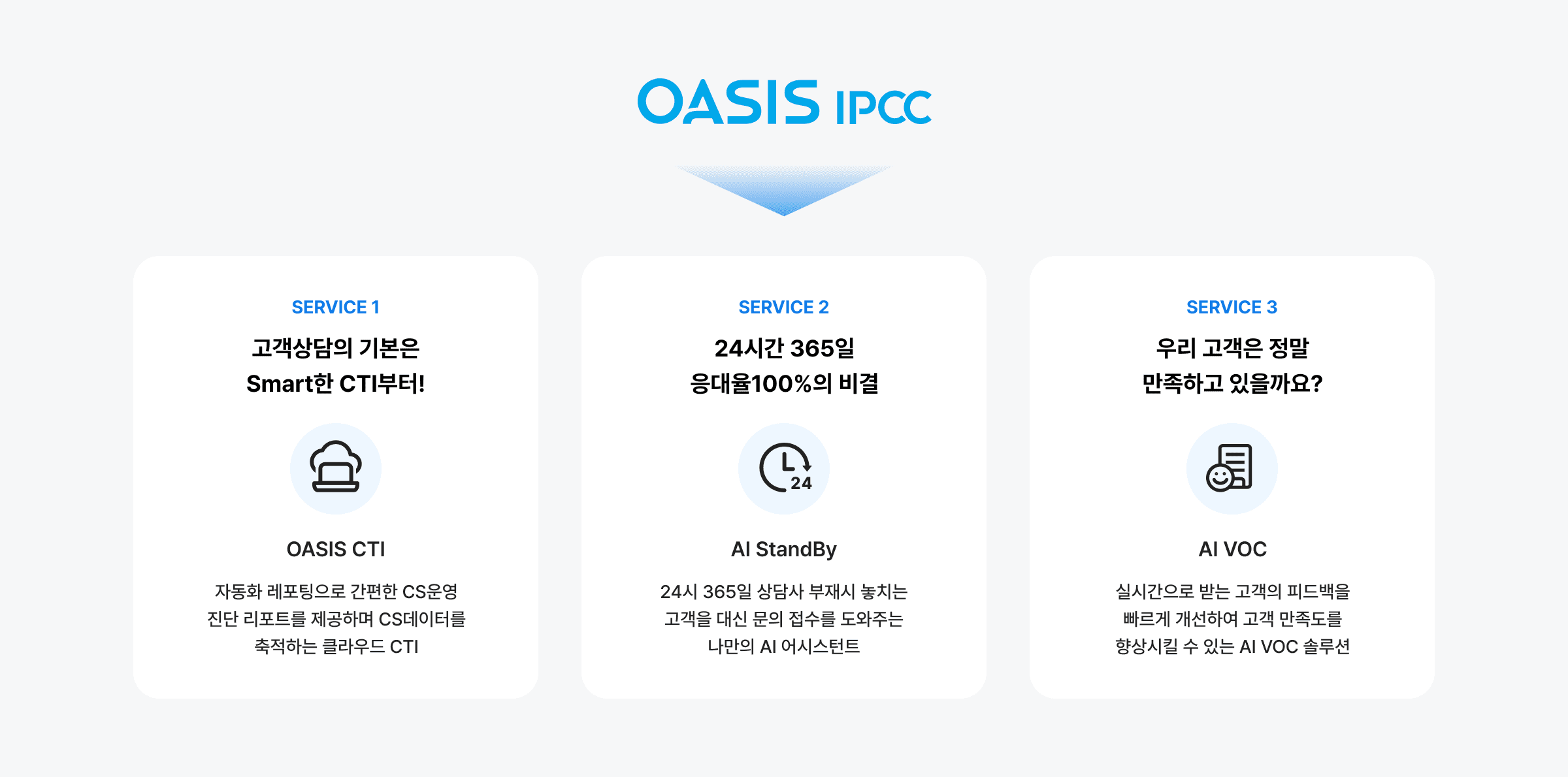 OASIS는 옴니 채널, CTI 자동화 리포팅, KMS, VOC 무인 접수 봇 등 All-in-one 서비스로 합리적 비용에 모두 제공합니다​.
