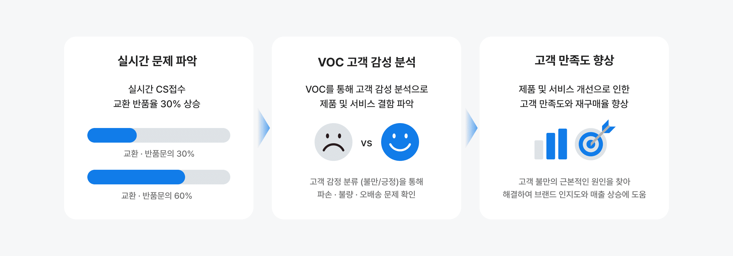 내부에서 Real Time VOC 관리 시스템을 통해 고객 불만 현황을 빠르게 파악하고 개선하여 고객 만족도를 향상시킬 수 있는 AI VOC 솔루션입니다.
