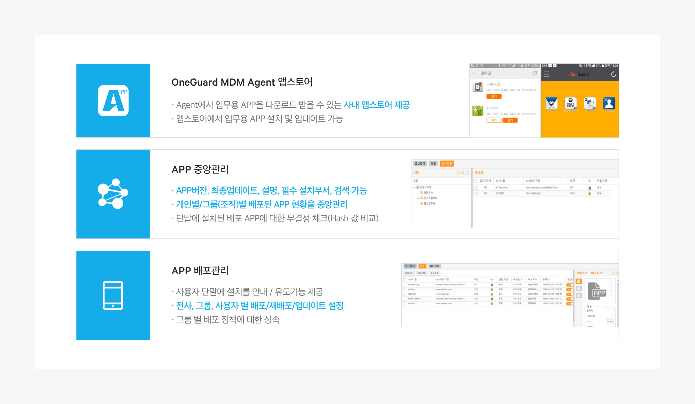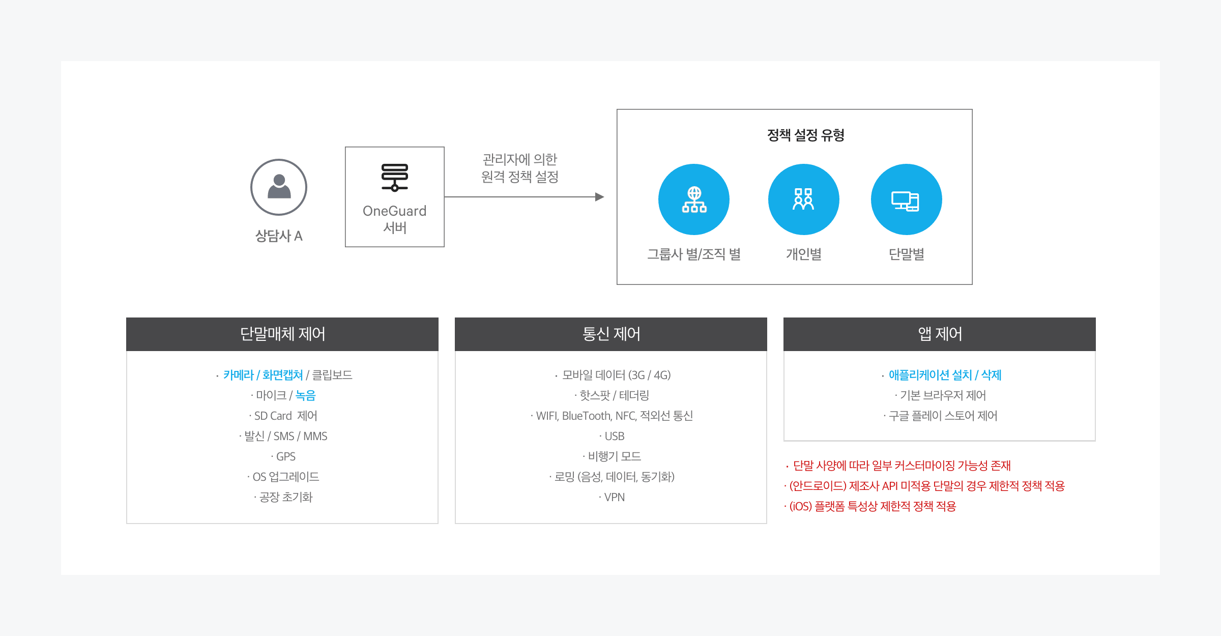 OneGuard는 기업 내의 중요 데이터가 스마트폰 사용자의 모바일 디바아스를 통해 불법적으로 유출됨을 통제하고, 모바일 디바이스의 하드웨어 및 데이터 전송을 제어하여 모바일 디바이스 내의 중요 데이터를 보호하기 위한 스마트폰 보안관리 솔루션입니다.
