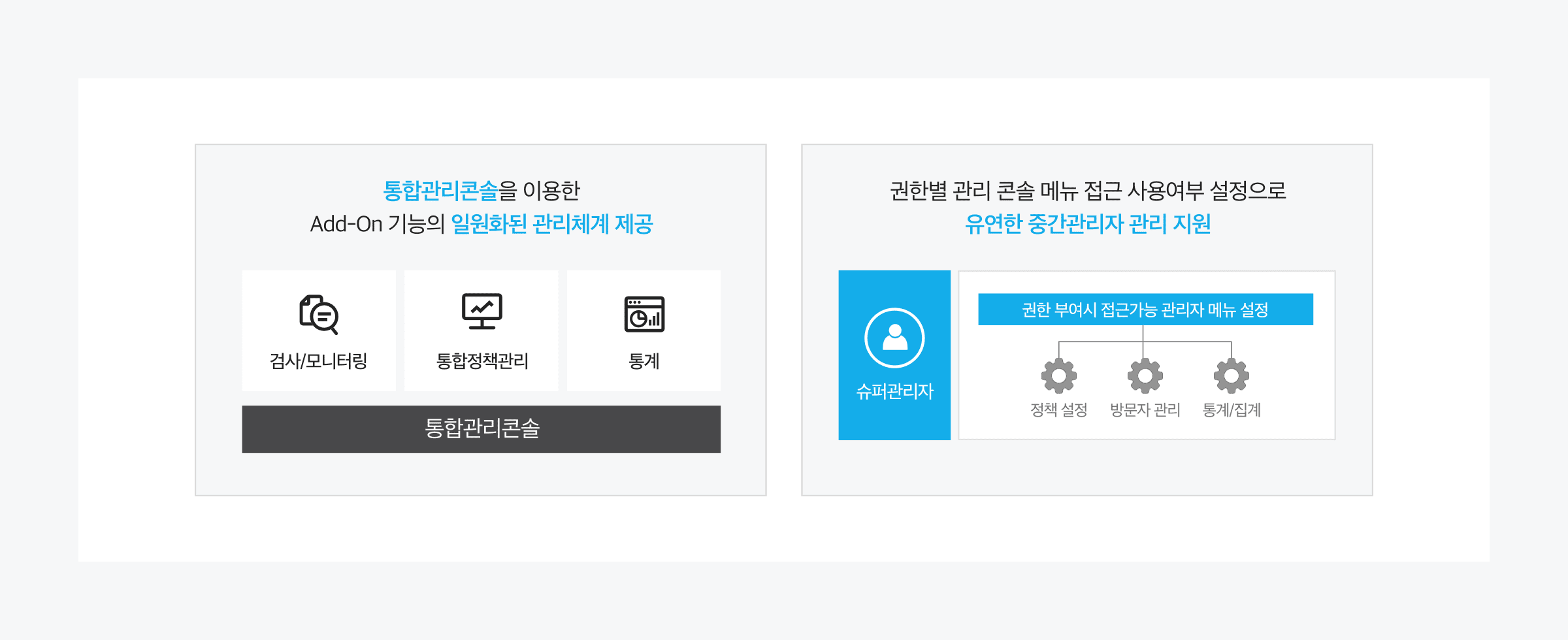 또한, 통합 관리 콘솔은 권한 기반으로 부관리자 설정 기능을 지원하여 유연한 관리체계 구축이 가능합니다.