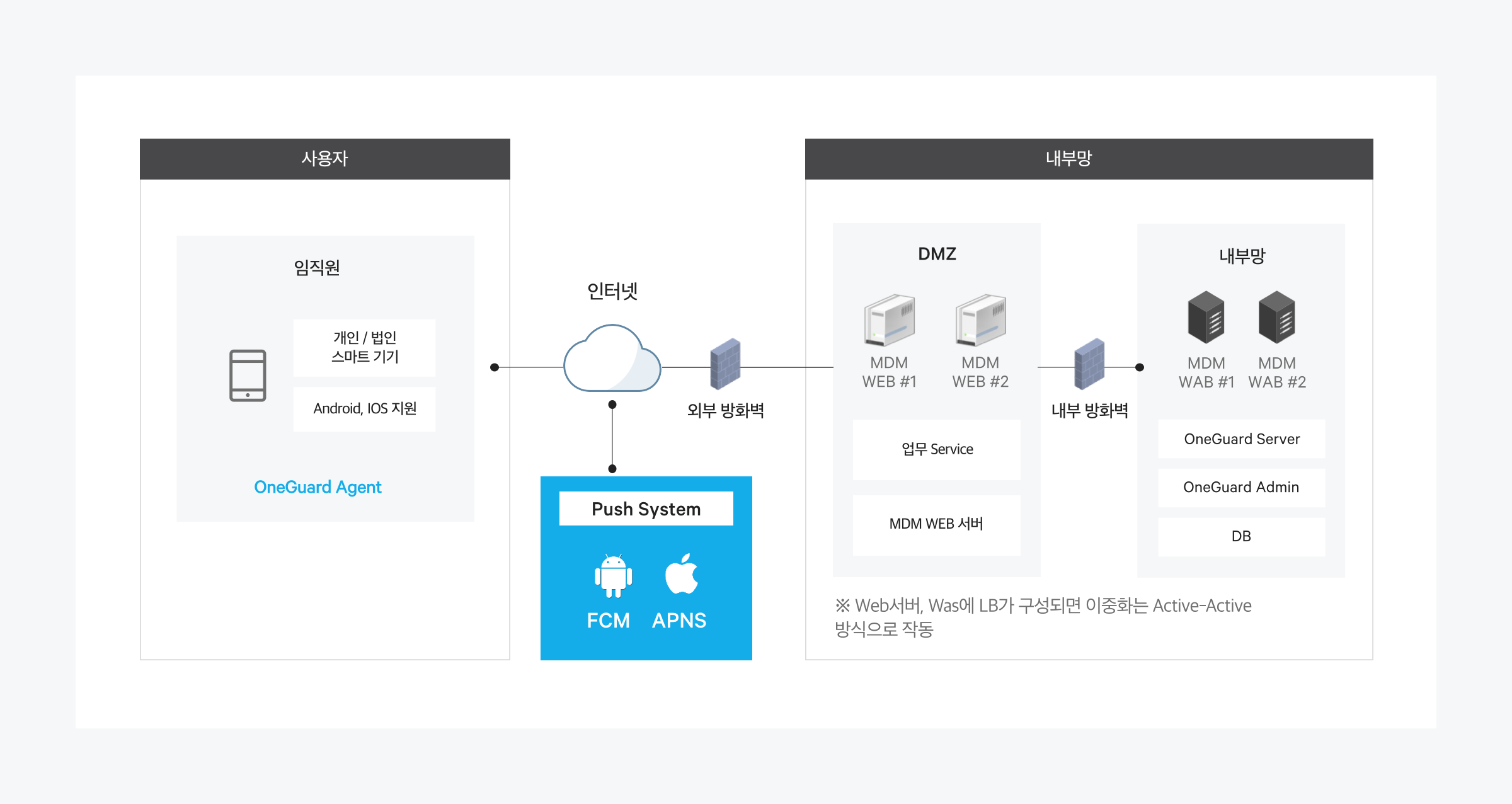 단말 제어를 위해 사용자 단말기에는 MDM Agent가 설치되고, 가용성 확보를 위해 WEB/WAS/DB는 이중화 구성을 권장합니다. Push System은 FCM / APNS를 활용합니다.