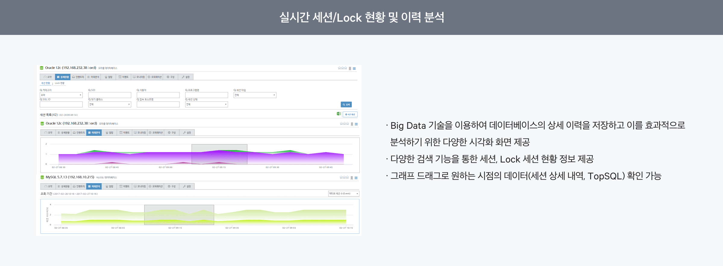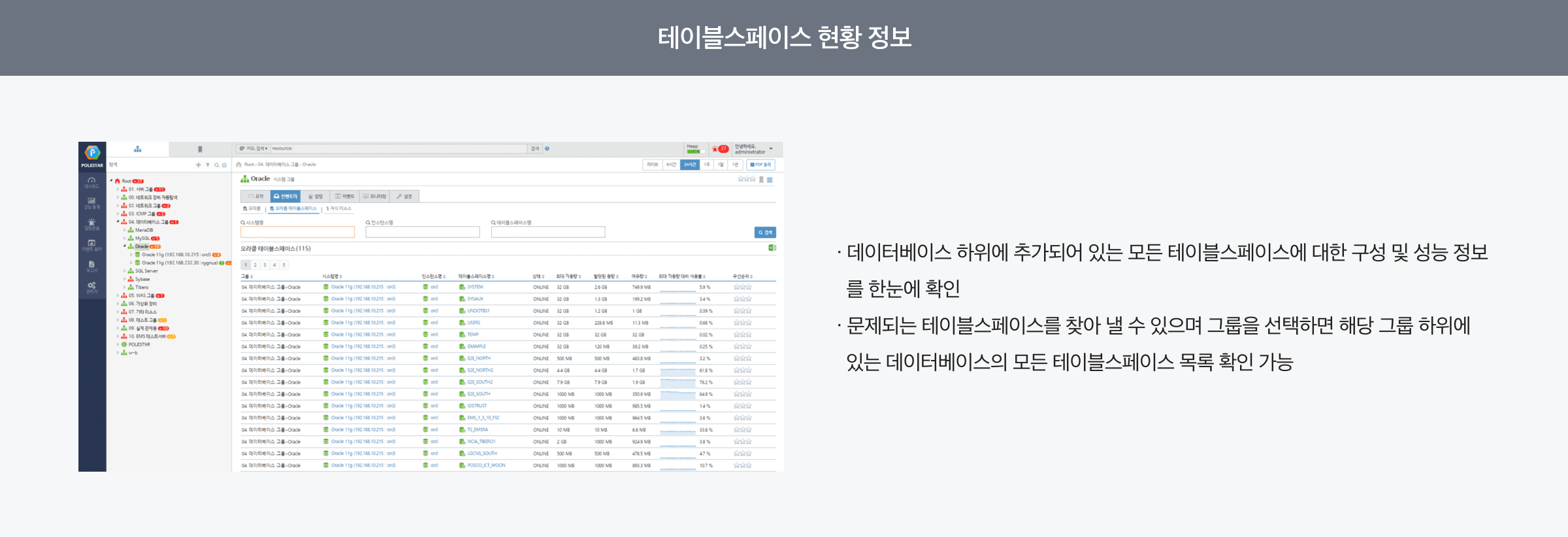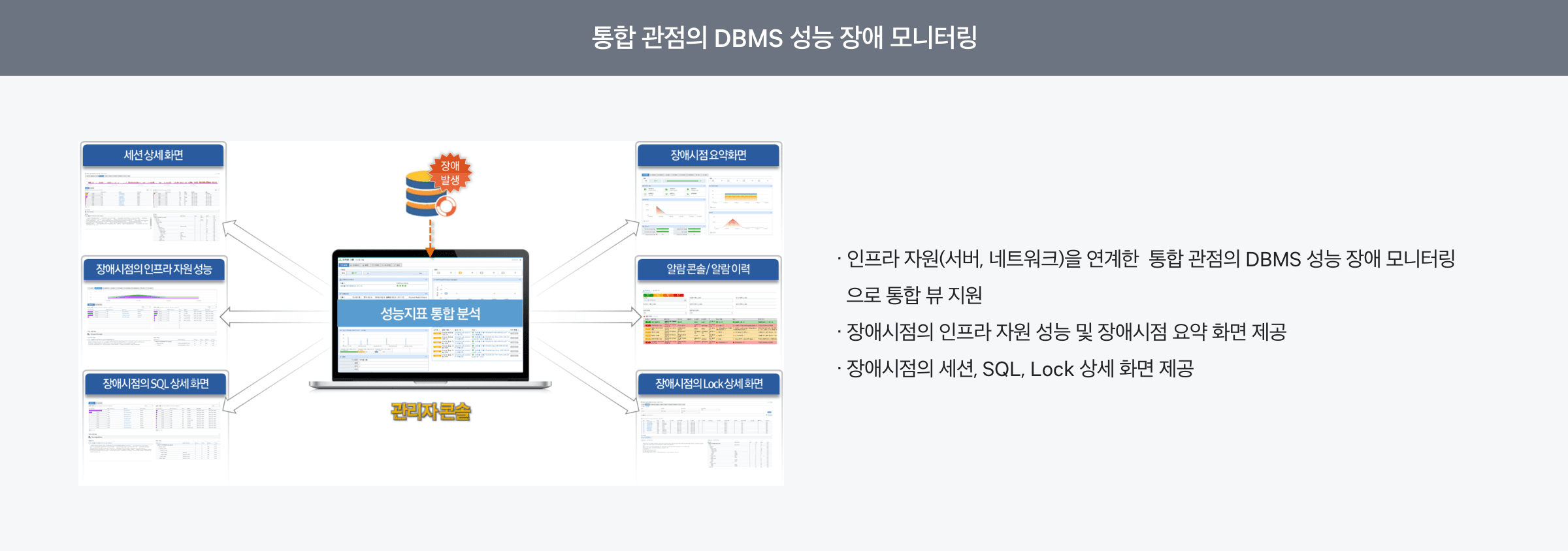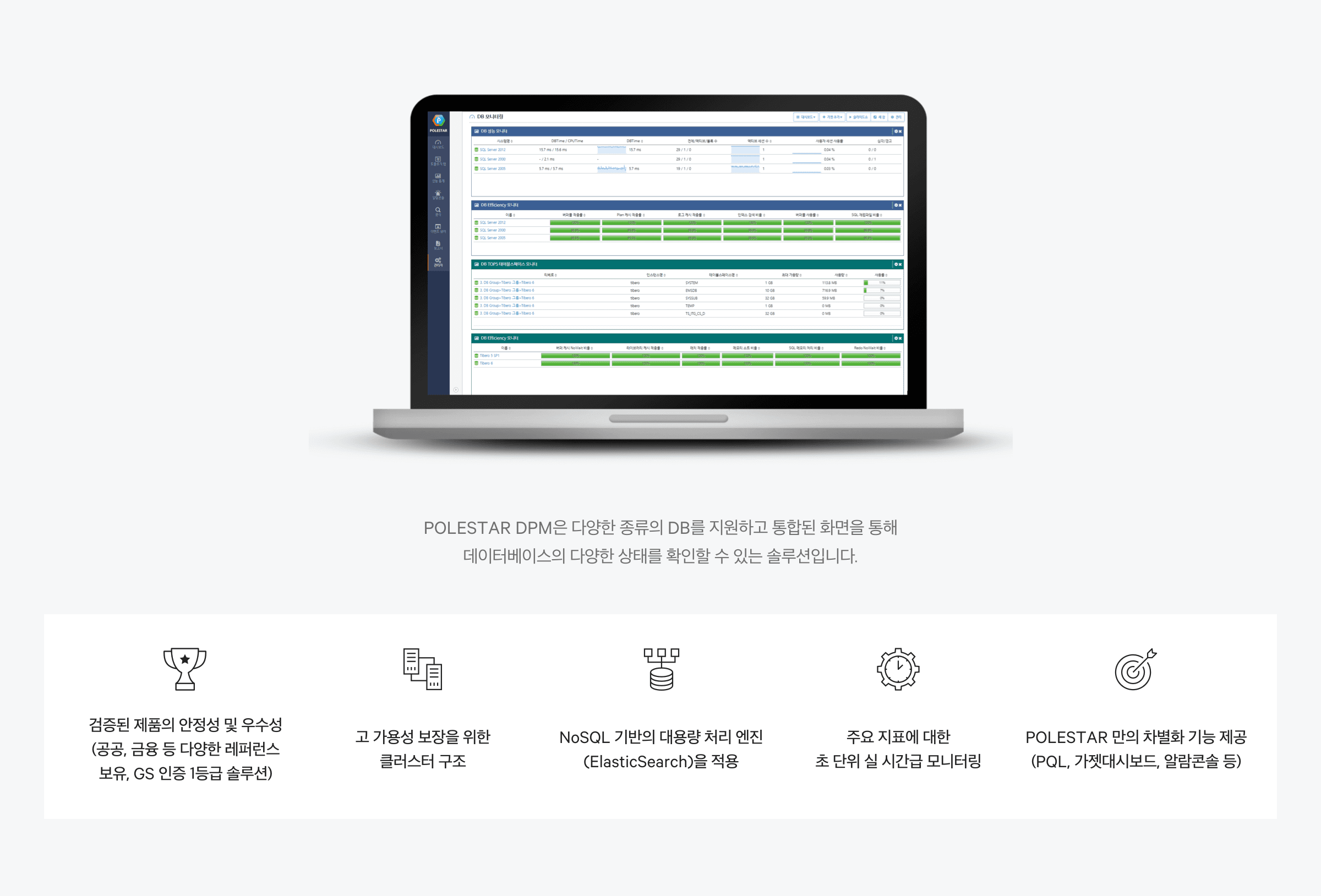 Polestar DPM은 다양한 DBMS(Oracle, MS-SQL, Tibero, MySQL, Maria DB, DB2 등)를 동일 UI로 통합모니터링을 제공하며, 인프라 자원(서버,네트워크 등)을 연계한 통합관점의 DBMS 성능 장애 모니터링을 제공합니다. 실시간 모니터링 및 구성, 성능, 장애, 이벤트, 통계/분석 및 대시보드 기능을 제공하는 모니터링 솔루션입니다. NW/DB/WAS/Web 서비스/ E2E/컨테이너/가상화/Public Cloud에 대한 모니터링 기능도 플러그인 방식으로 기능 추가가 가능한 종합 모니터링 솔루션입니다.