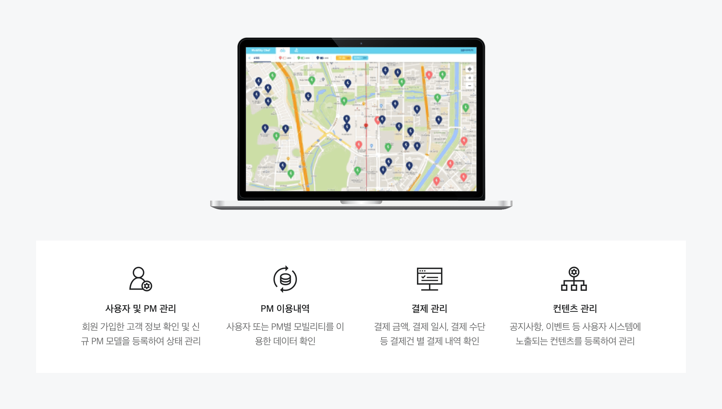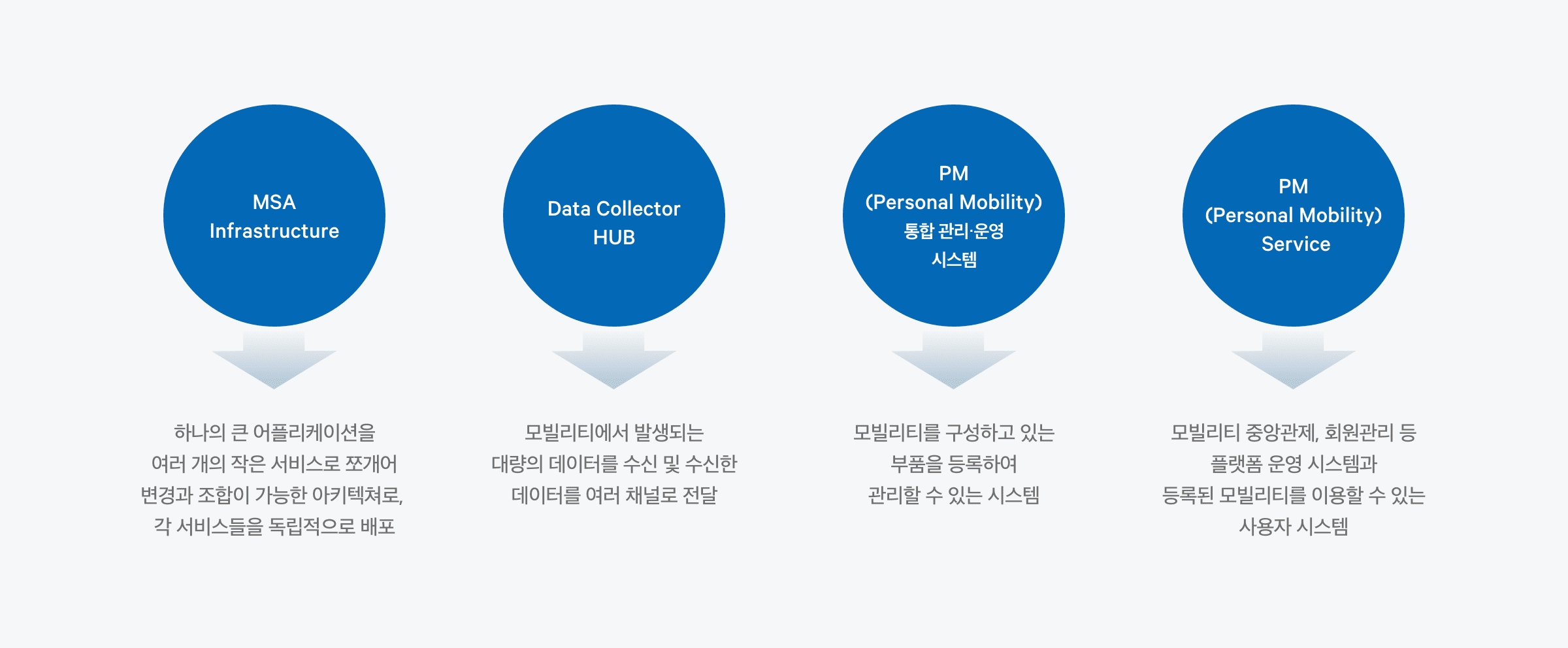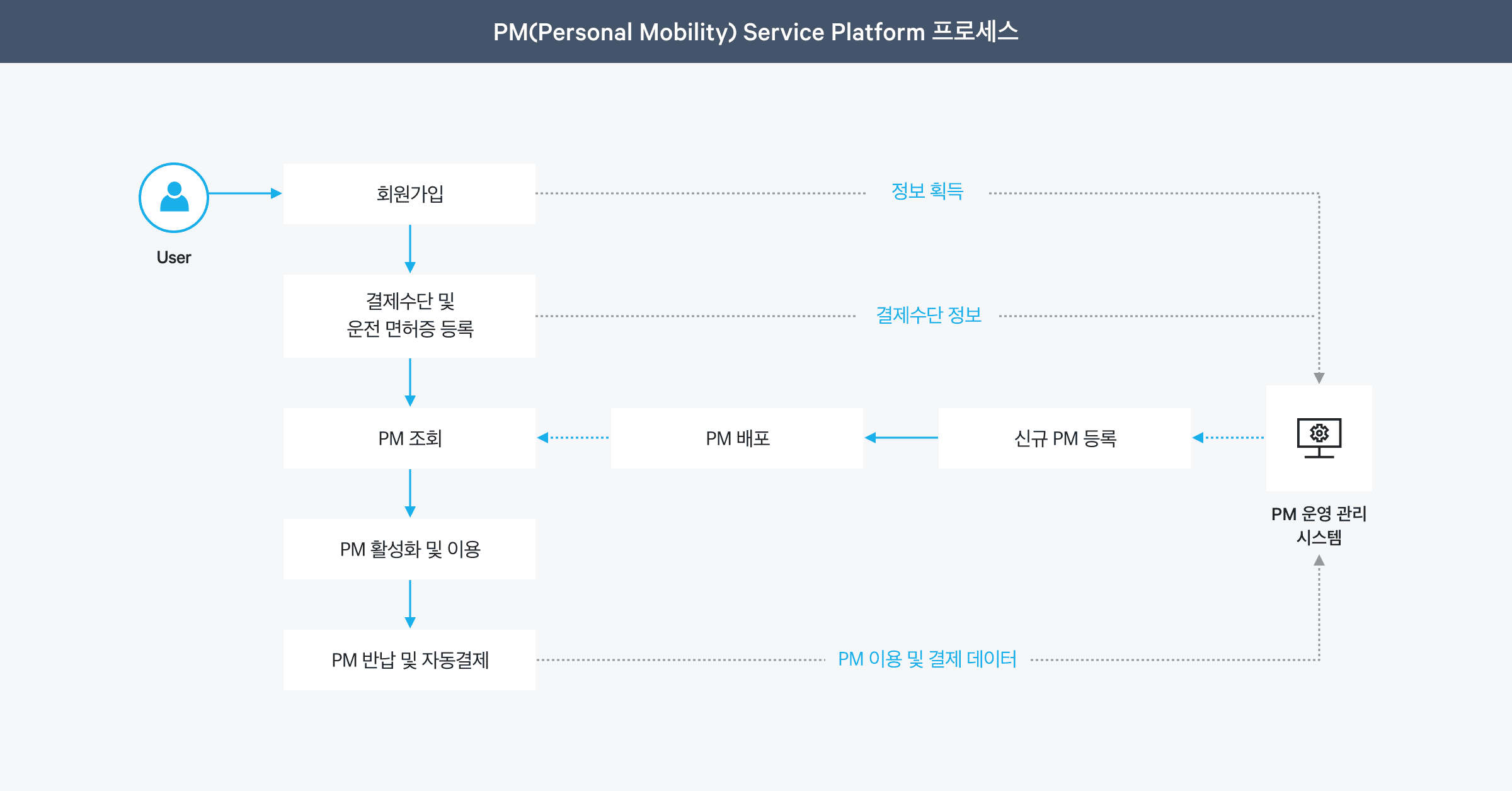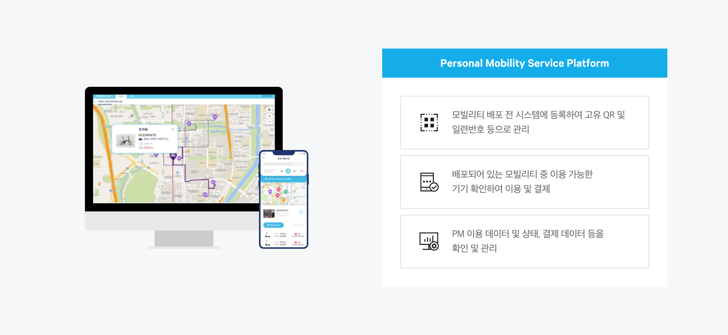 PM(Personal Mobility) 통합 관리・운영 서비스는  운영중인 서비스의 데이터 수집, 생산되는  하드웨어 부품 및  하드웨어 관리 , 사용자 및 이용 데이터 수집 및 관리 시스템을 통합으로 관리, 운영 할 수 있는 서비스입니다.