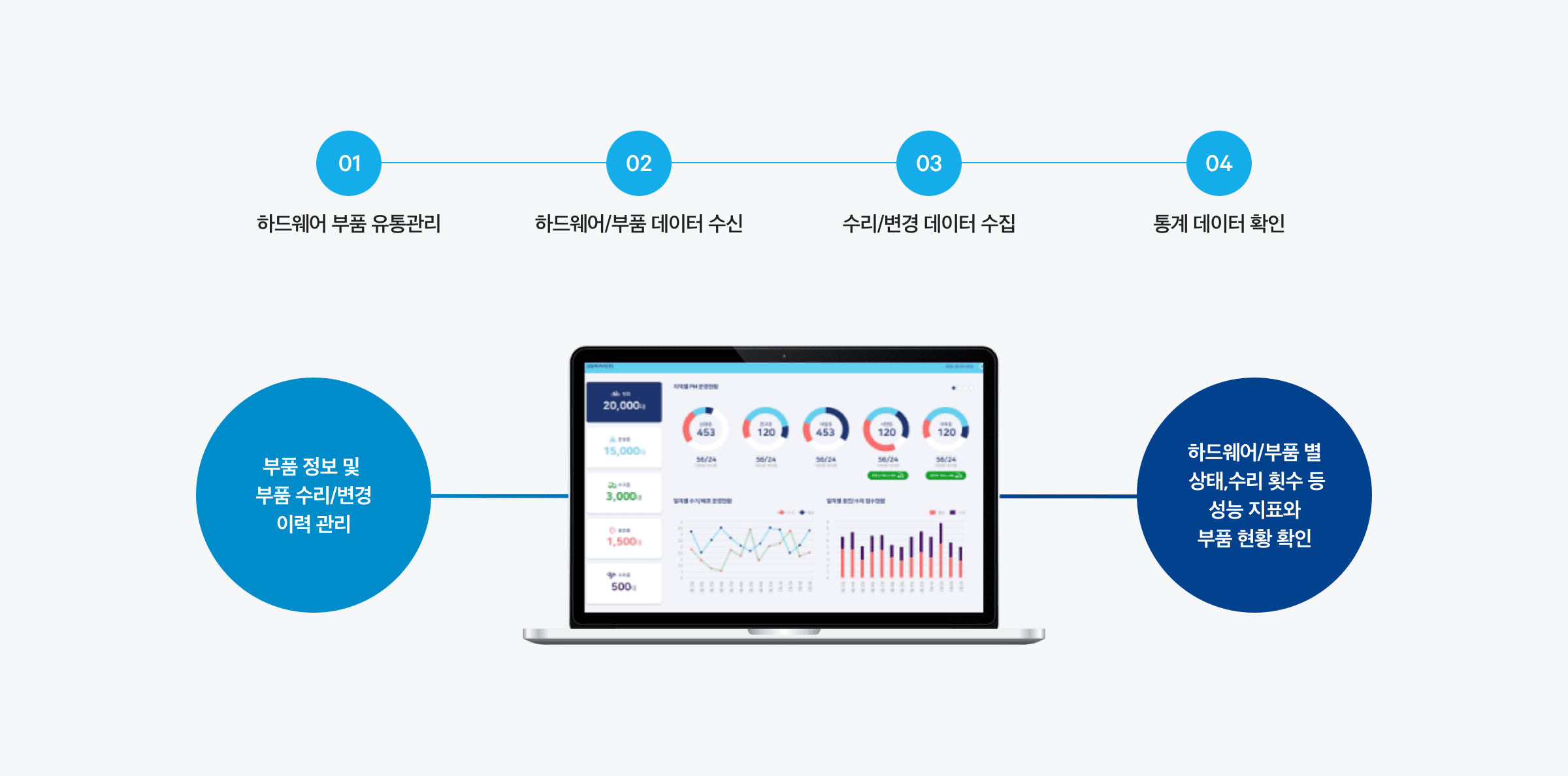 이를 바탕으로 하드웨어의 교체나 수리 등 관리 히스토리 데이터를 수신하여 부품 별 수리/변경 데이터를 수집하고, 수집한 데이터들을 통계 데이터로 확인할 수 있는 기능을 제공합니다.