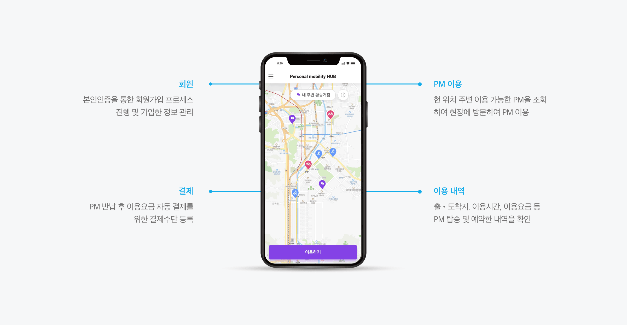 PM 사용자 시스템은 사용자의 현 위치를 기반으로 주변 PM을 조회하여 위치를 확인하고, 현장에 방문하여 QR코드 스캔을 통해 PM을 활성화시켜 이용하는 PM 이용부터 결제수단을 등록하여 자동결제 기능까지 사용자가 PM을 이용하기 위한 기능을 제공합니다.