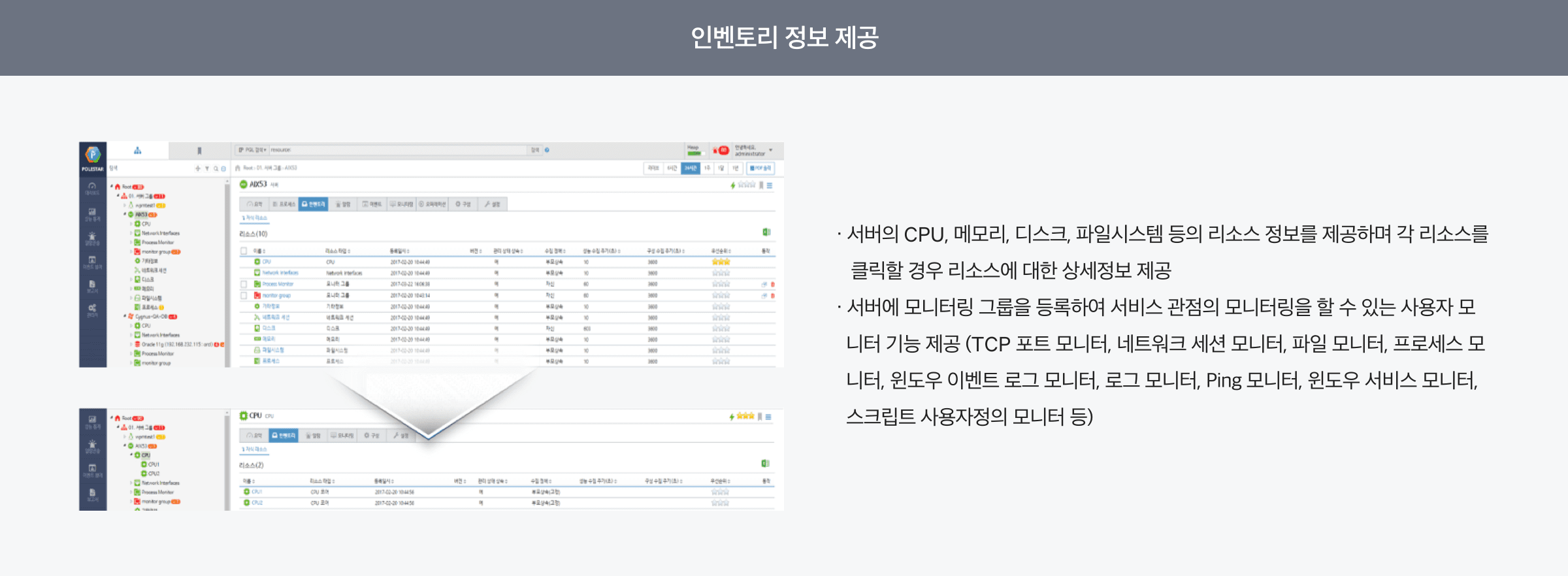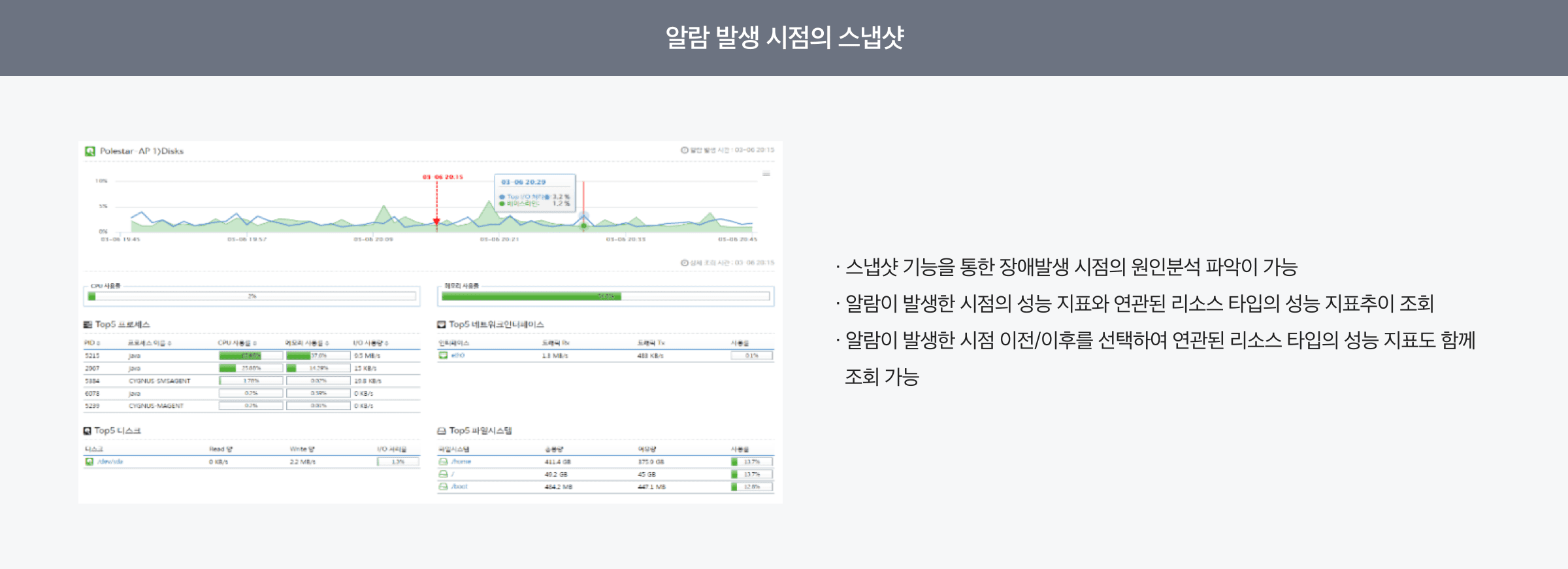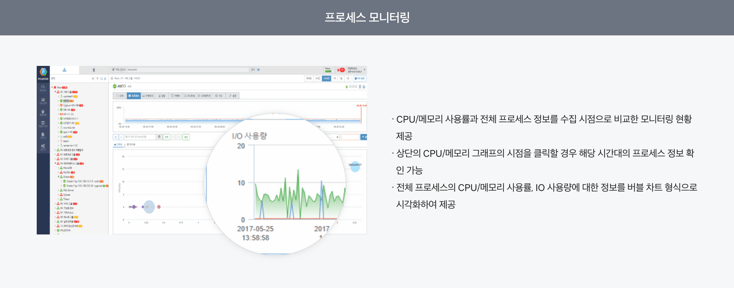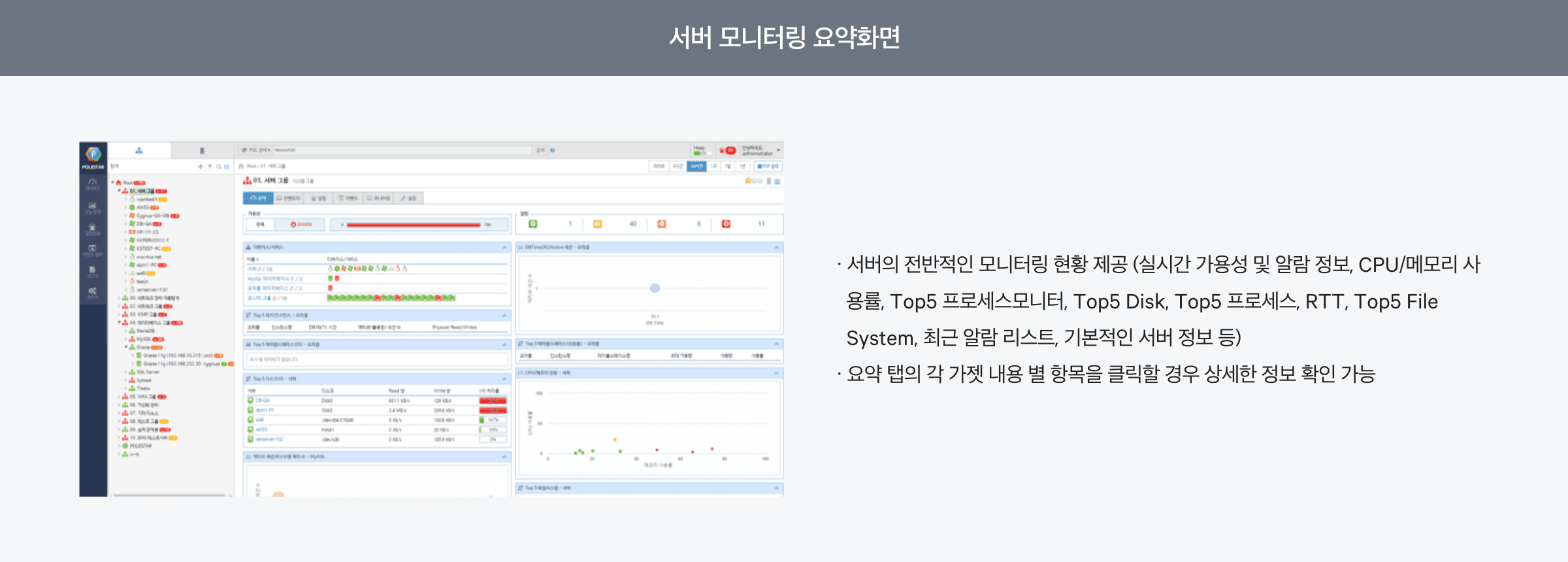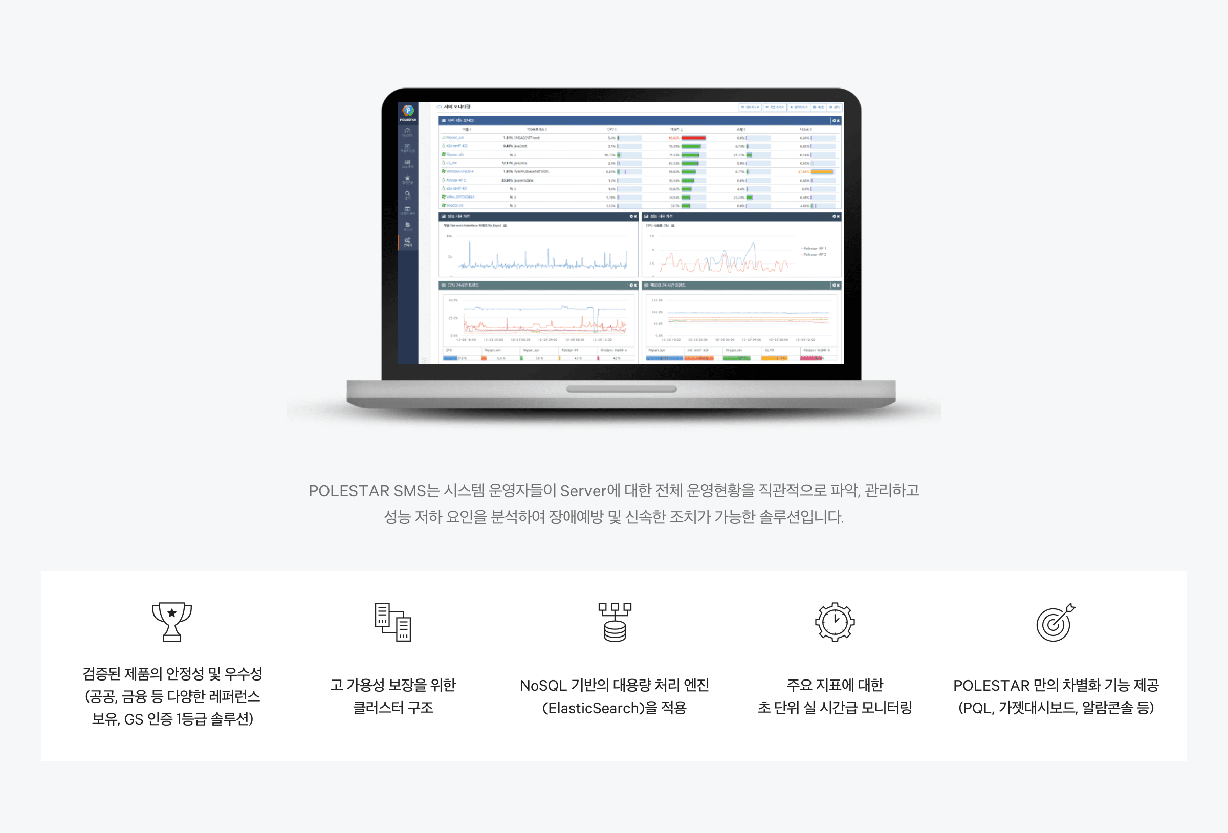 Polestar SMS는 초단위 실시간 모니터링 기능 및 구성, 성능, 장애, 이벤트, 통계/분석 및 대시보드 기능을 제공하는 모니터링 솔루션입니다. NW/DB/WAS/Web 서비스/ E2E/컨테이너/가상화/Public Cloud에 대한 모니터링 기능도 플러그인 방식으로 기능 추가가 가능한 종합 모니터링 솔루션입니다.