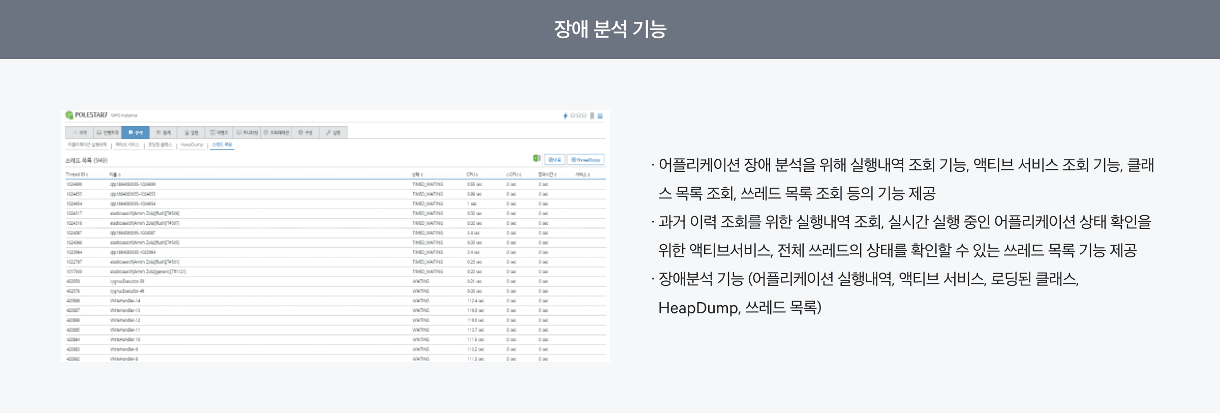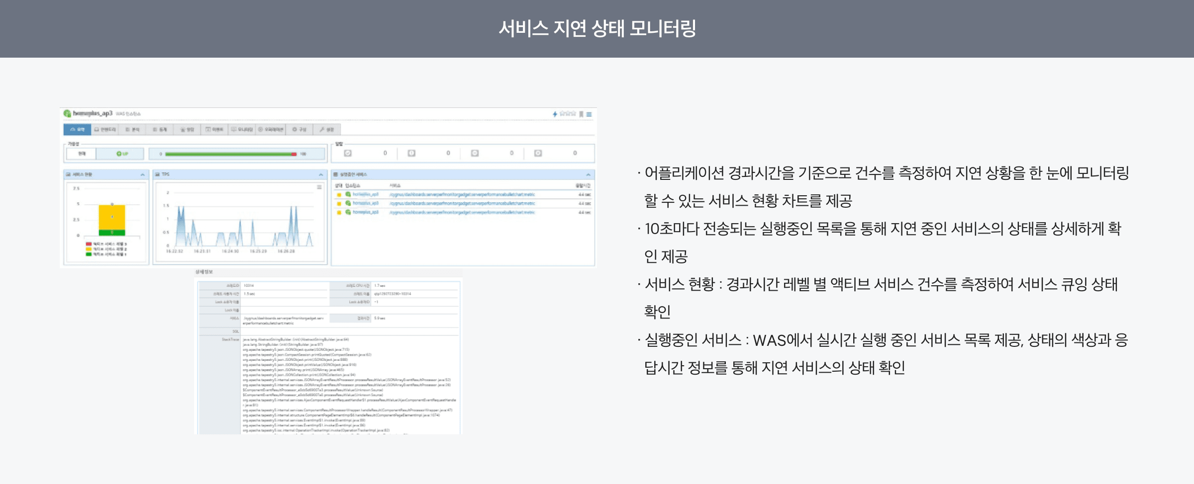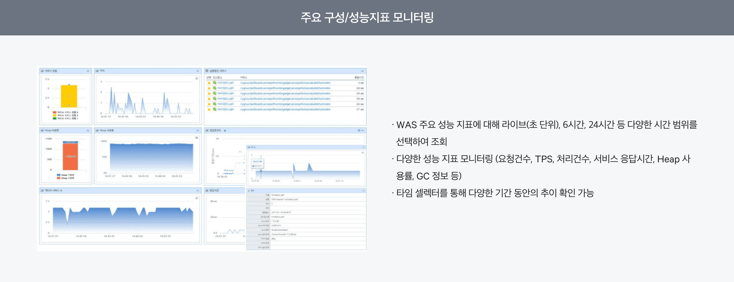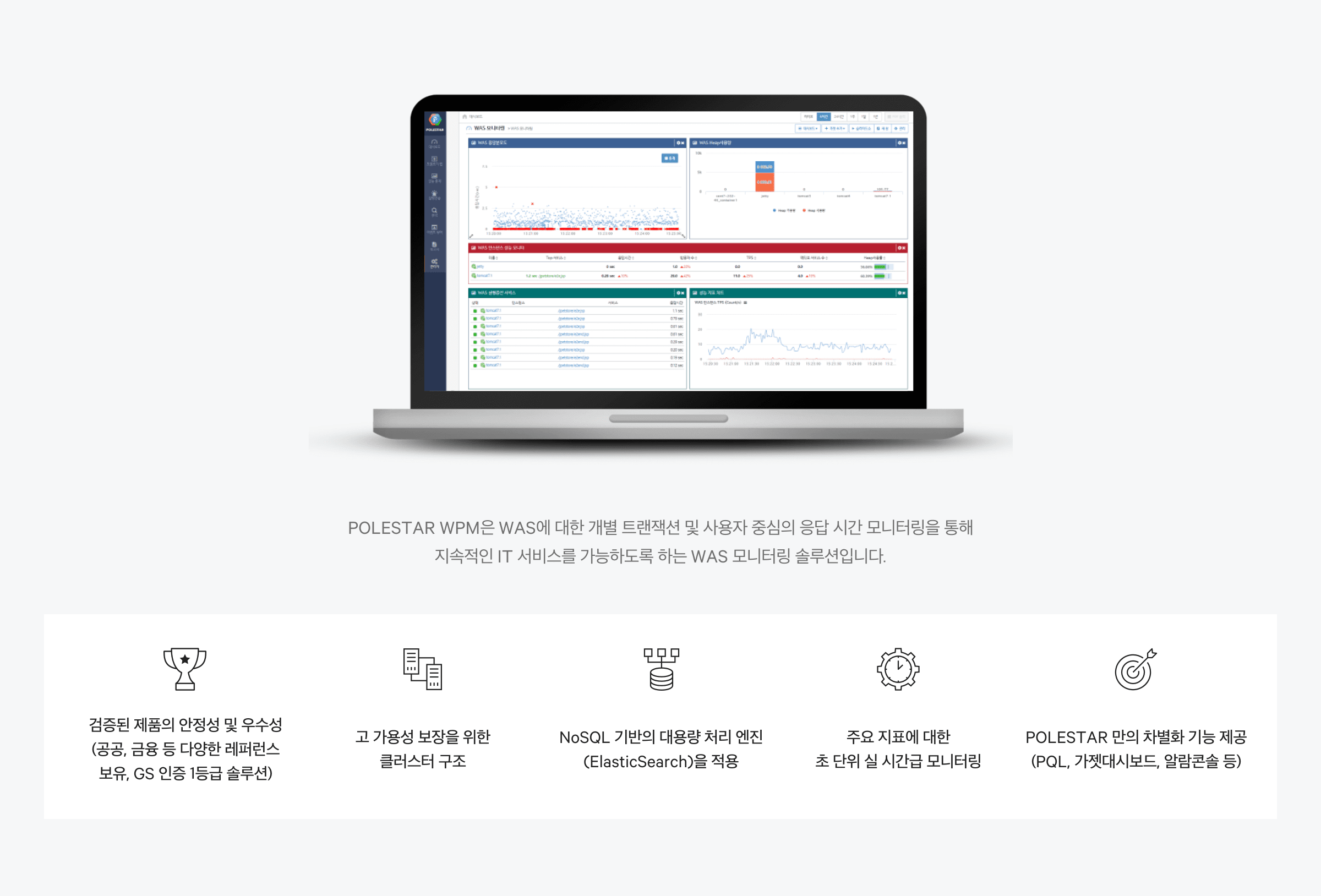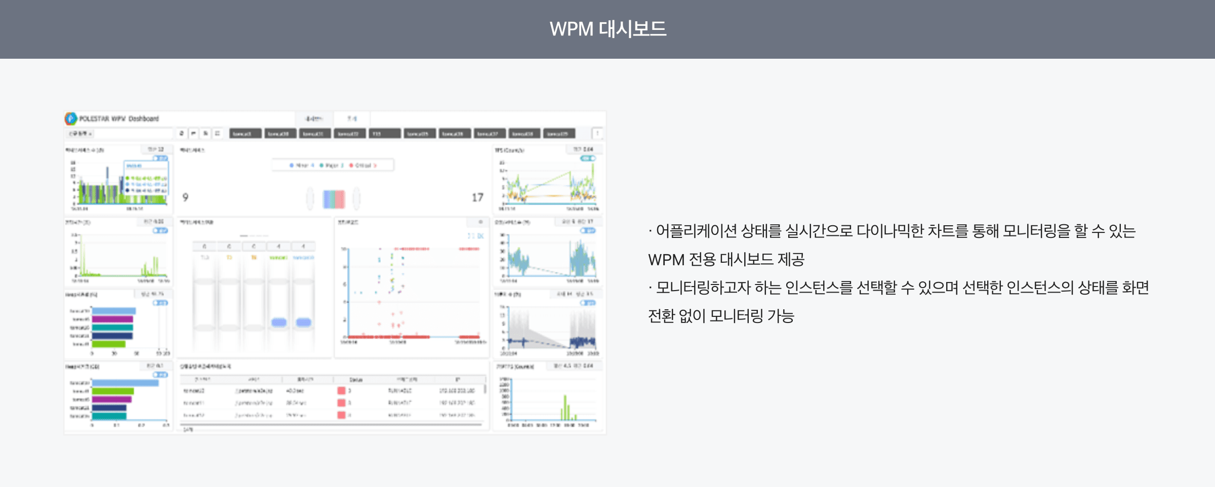 Polestar WPM은 다양한 WAS(JBoss, Tomcat, WebLogic, WebSphere, JEUS 등)에 대한 실시간 모니터링 및 구성, 성능, 장애, 이벤트, 통계/분석 및 대시보드 기능을 제공하며, 인프라 자원(서버,네트워크 등)을 연계한 통합관점의 WAS 성능 장애 모니터링 기능을 제공합니다. NW/DB/WAS/Web 서비스/ E2E/컨테이너/가상화/Public Cloud에 대한 모니터링 기능도 플러그인 방식으로 기능 추가가 가능한 종합 모니터링 솔루션입니다.