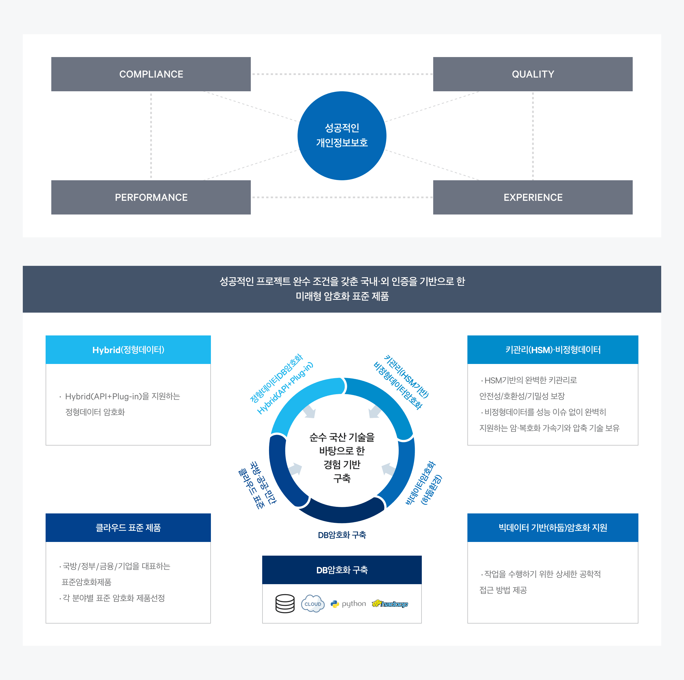 국산 DB암호화 업계 최초 국내·외 법규 준수와 고성능 보안조치를 동시에 만족시키는 DB암호화 1세대 전문기업의 제품입니다.