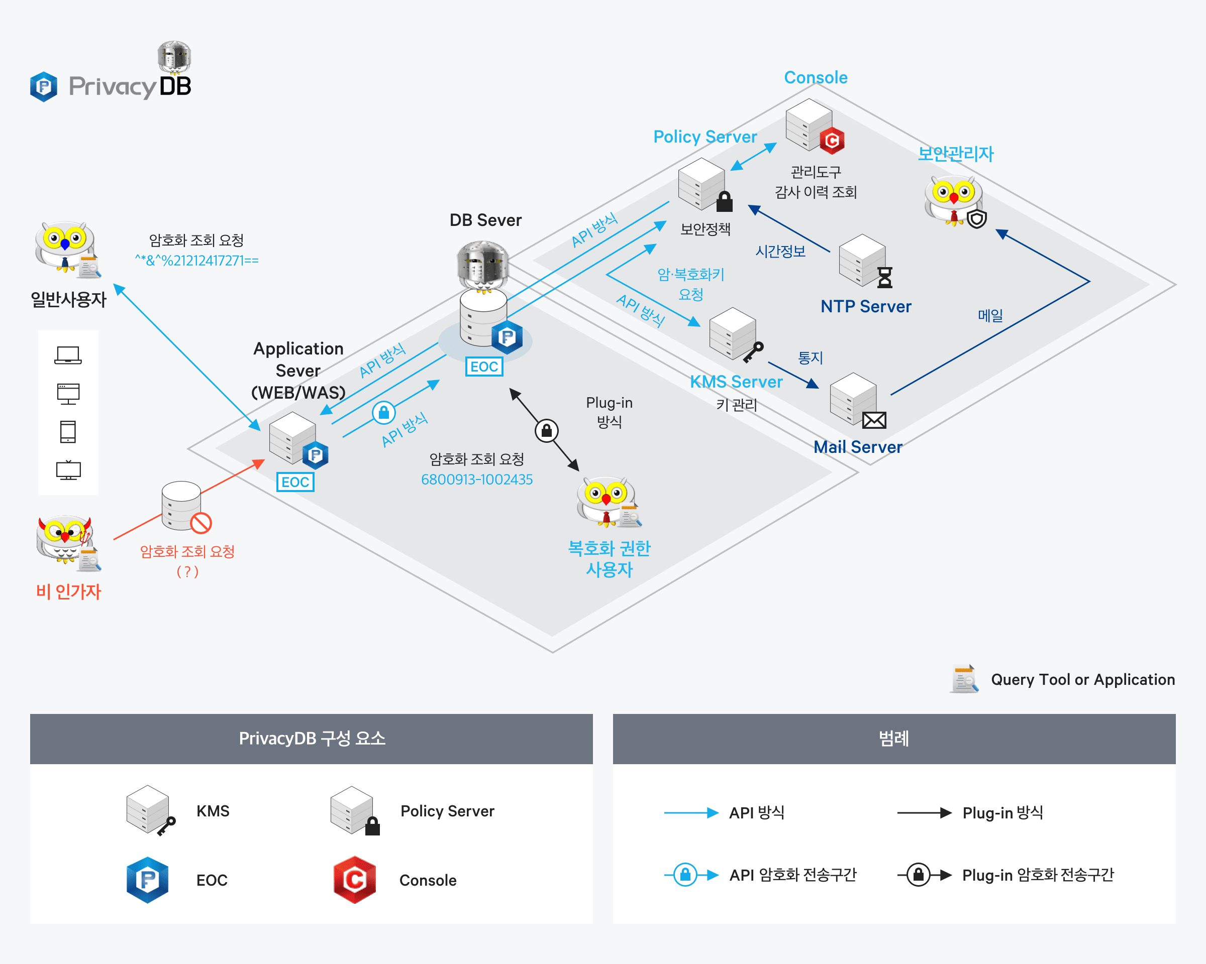 PrivacyDB(프라이버시디비)는 API와 Plug-in 방식을 혼용한 Hybrid방식의 DB암호화 솔루션입니다.