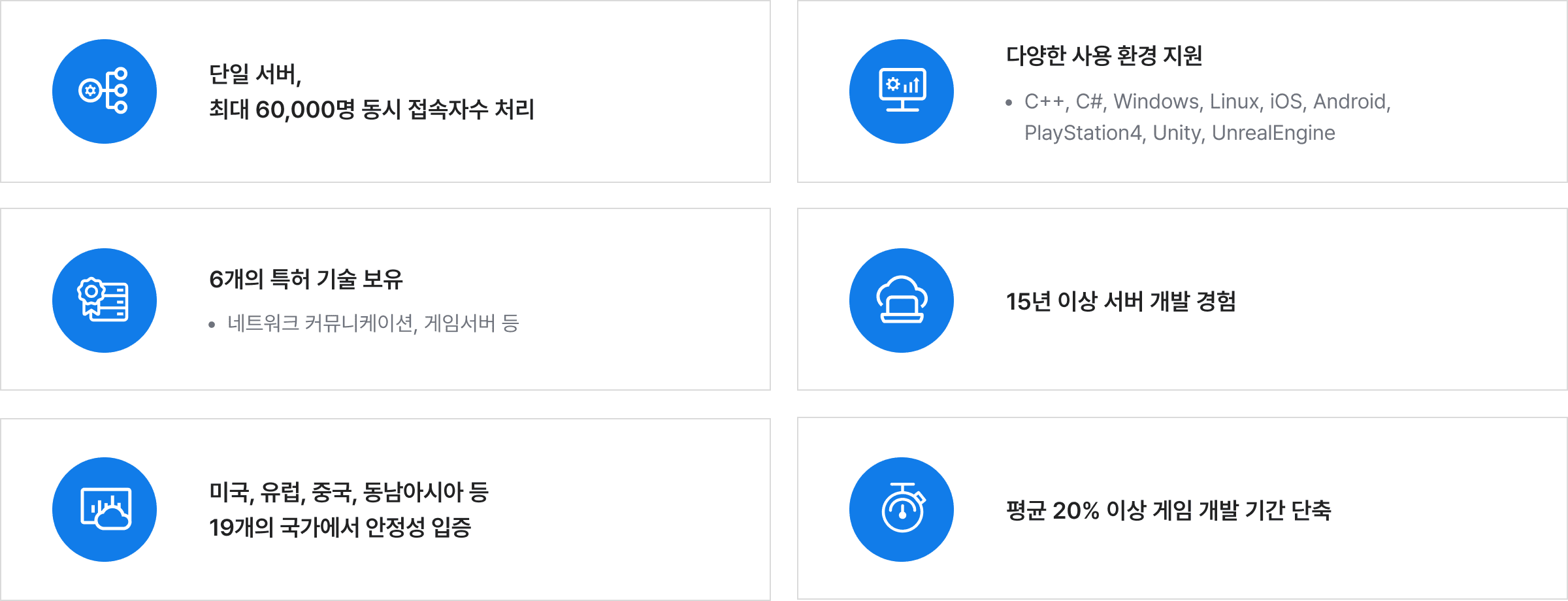 검증된 네트워크 기술력은 Nexon, Netmarble, Com2uS 등 대형 파트너사들의 대규모 AAA급 게임에서 신뢰를 받아왔으며, 별이되어라 II: 베다의 기사들, 일곱개의 대죄, 마구마구, 마비노기 영웅전, 스트리트 파이터 V, 세븐 나이츠 등 200개 이상의 게임에서 성공적으로 사용되었습니다.