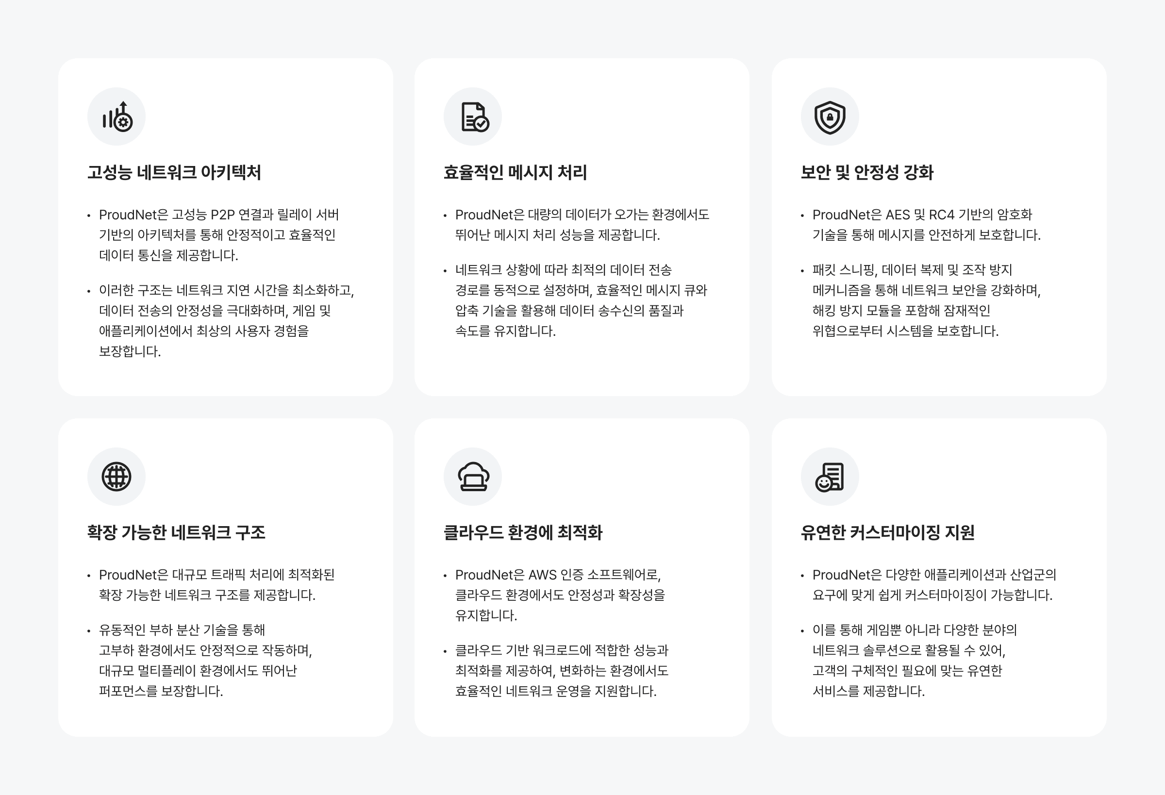 ProudNet은 게임 및 애플리케이션에 최적화된 고성능 네트워크 솔루션으로, P2P 연결성과 릴레이 서버를 통해 안정적이고 신뢰할 수 있는 통신 환경을 제공합니다. 전 세계 19개국에서 서비스 경험을 바탕으로 글로벌 환경에서의 원활한 서비스 운영을 지원하며, 다양한 네트워크 조건에서도 일관된 성능을 제공합니다.