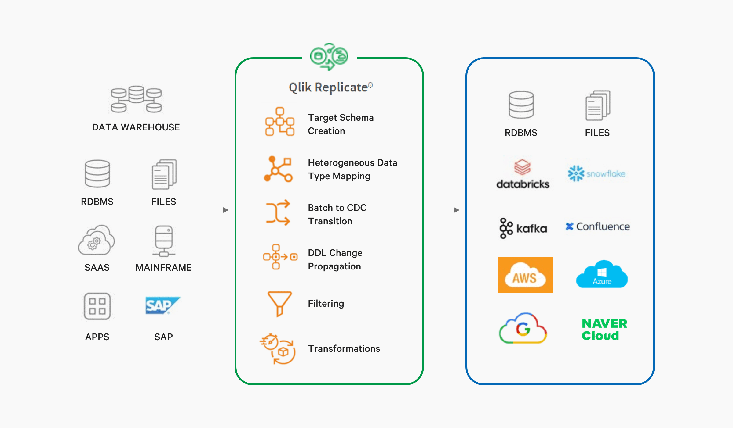 Qlik Replicate는 완전 자동화된 CDC(변경 데이터 캡처) 솔루션으로 별도의 에이전트 설치 없이 실시간으로 로그에서 데이터 수집하여 복제하는 구조입니다.
