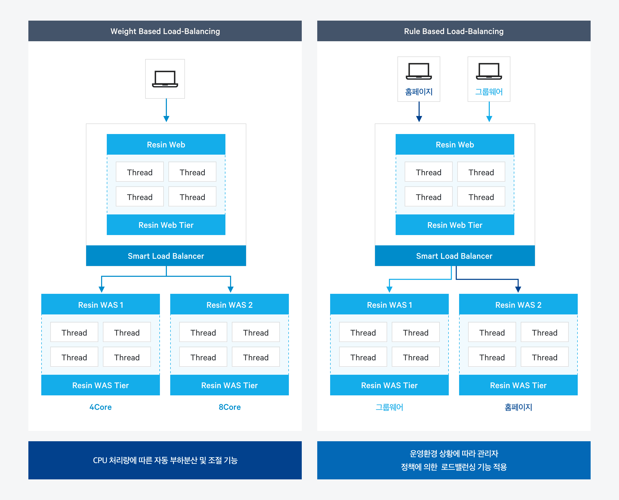 Resin Web Server는 멀티 인스턴스, 멀티 쓰레드를 지원하며, Smart Load Balancer 모듈로 WAS와 연동 됩니다.