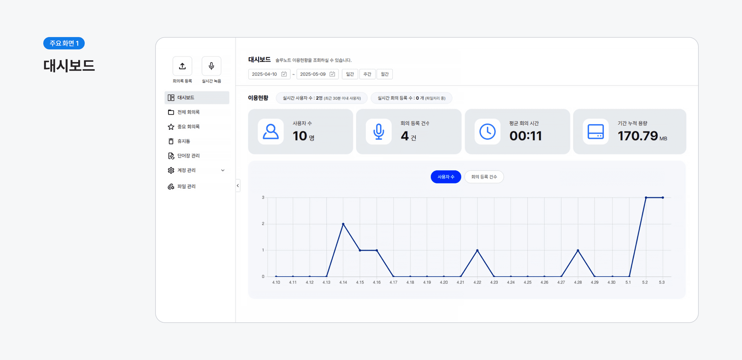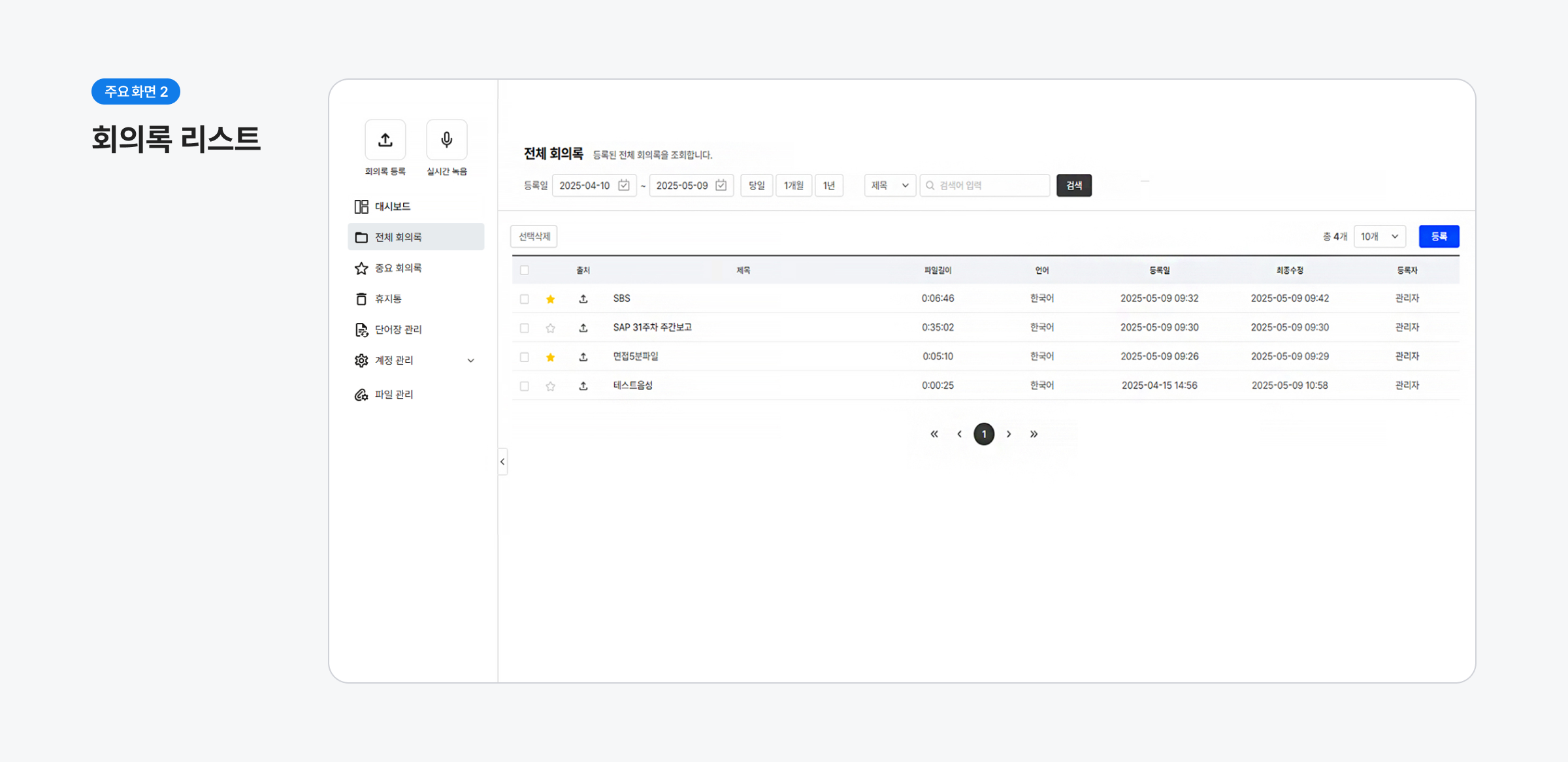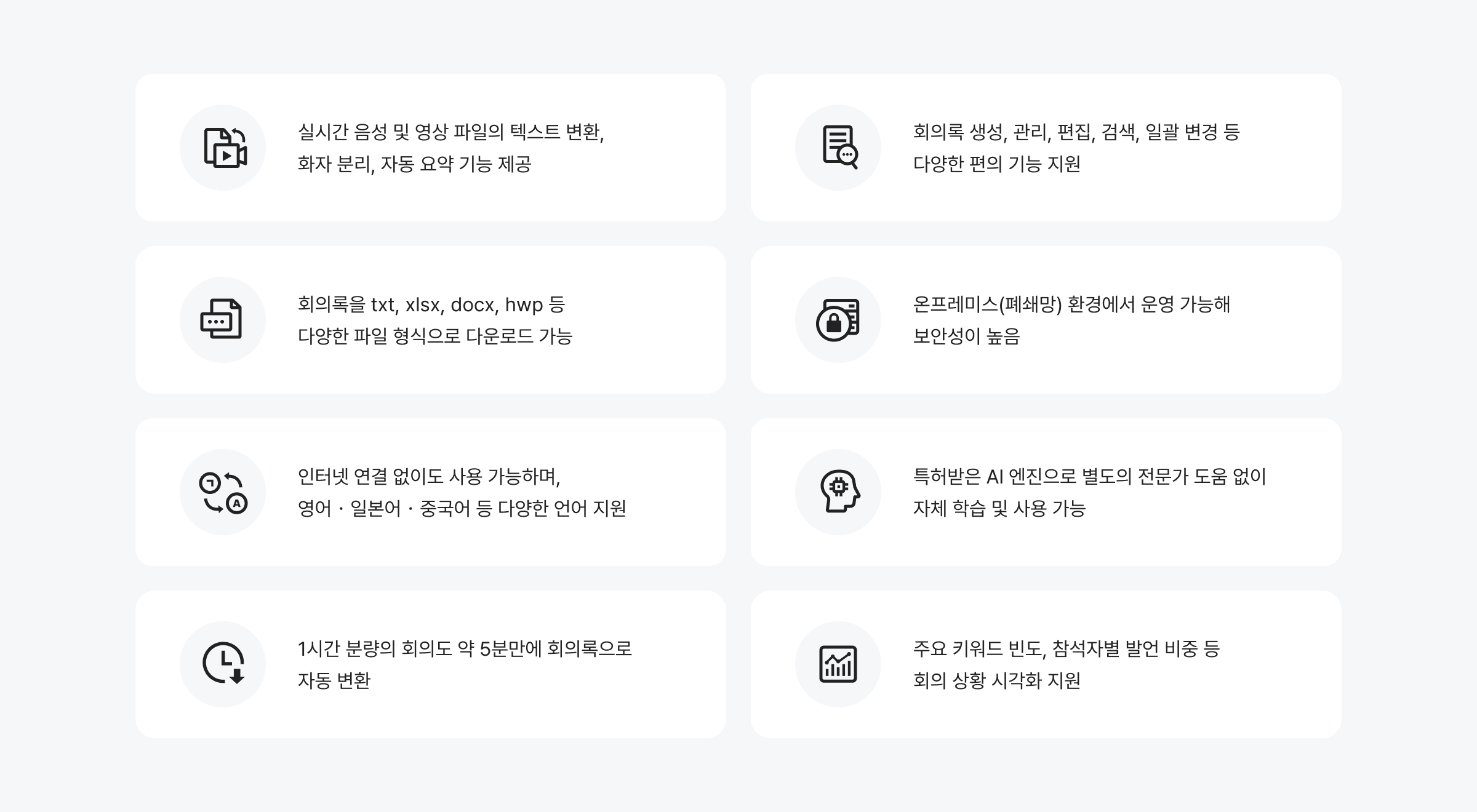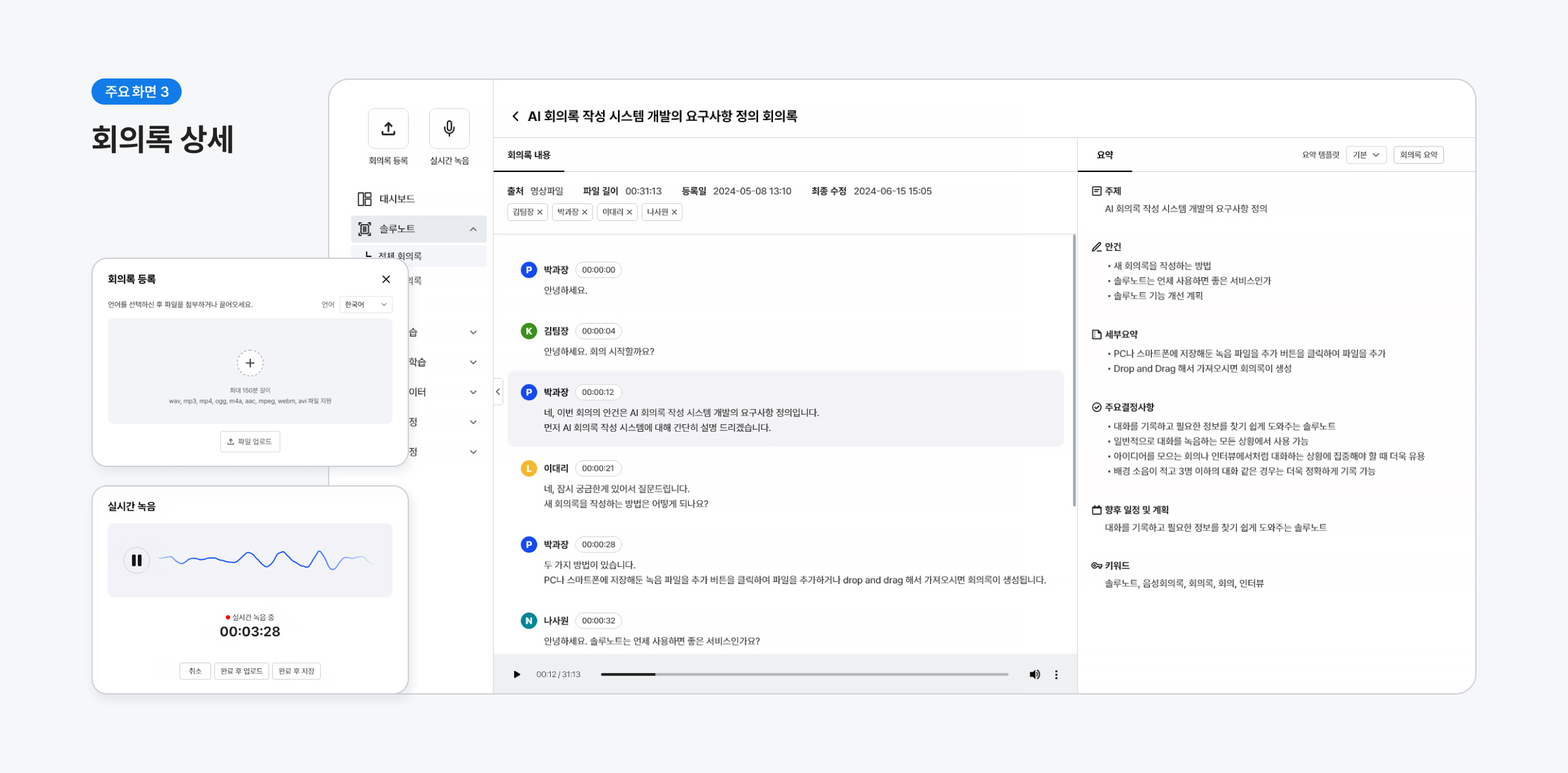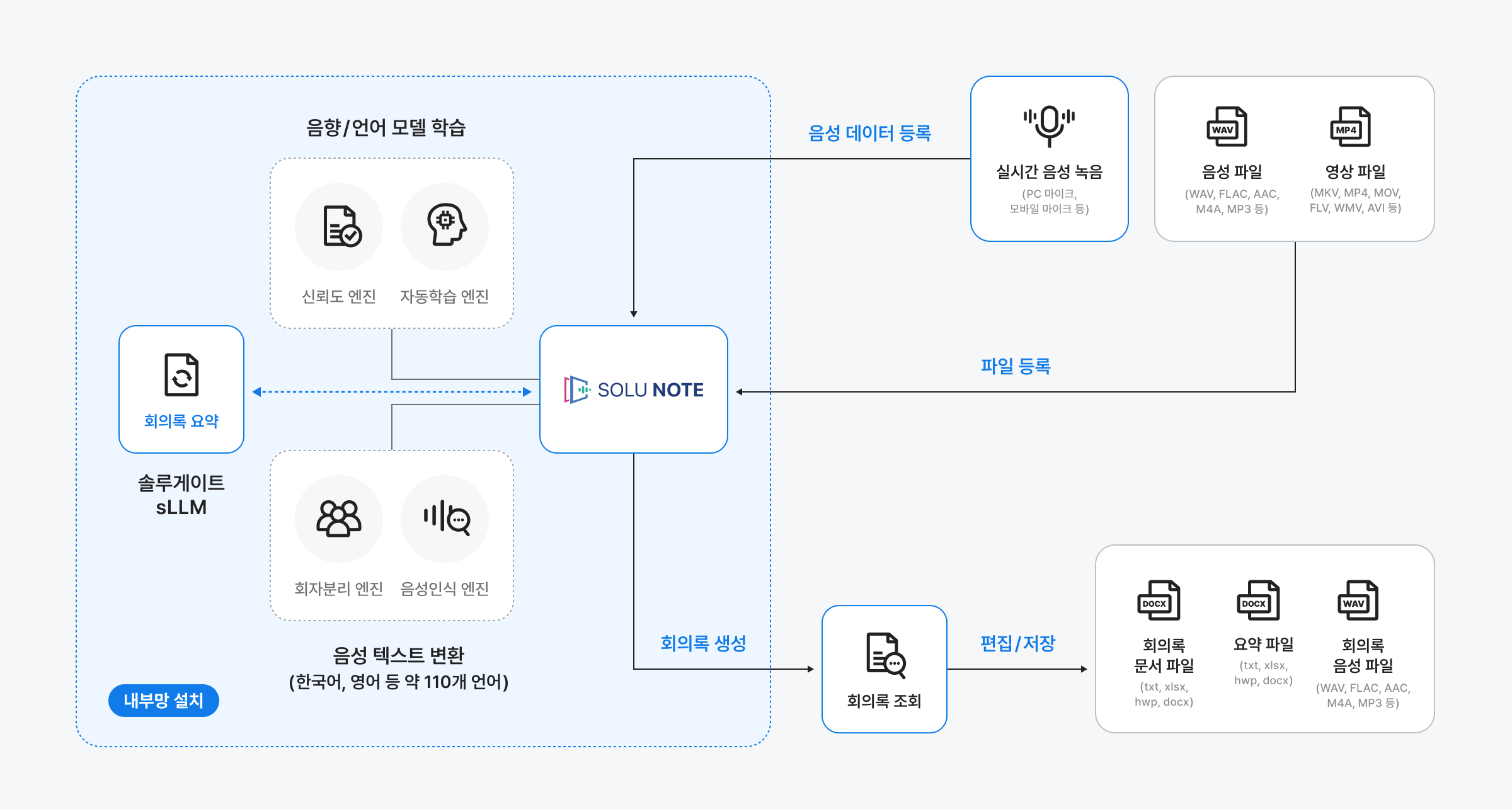 솔루노트 솔루션은 솔루게이트가 개발한 AI 기반의 음성인식 회의록 솔루션입니다. 실시간 녹음 또는 녹취 음성 영상 파일을 등록하면, 자동으로 텍스트 변환과 화자분리 기술을 통해 자등 회의록을 생성해 주는 시스템입니다.