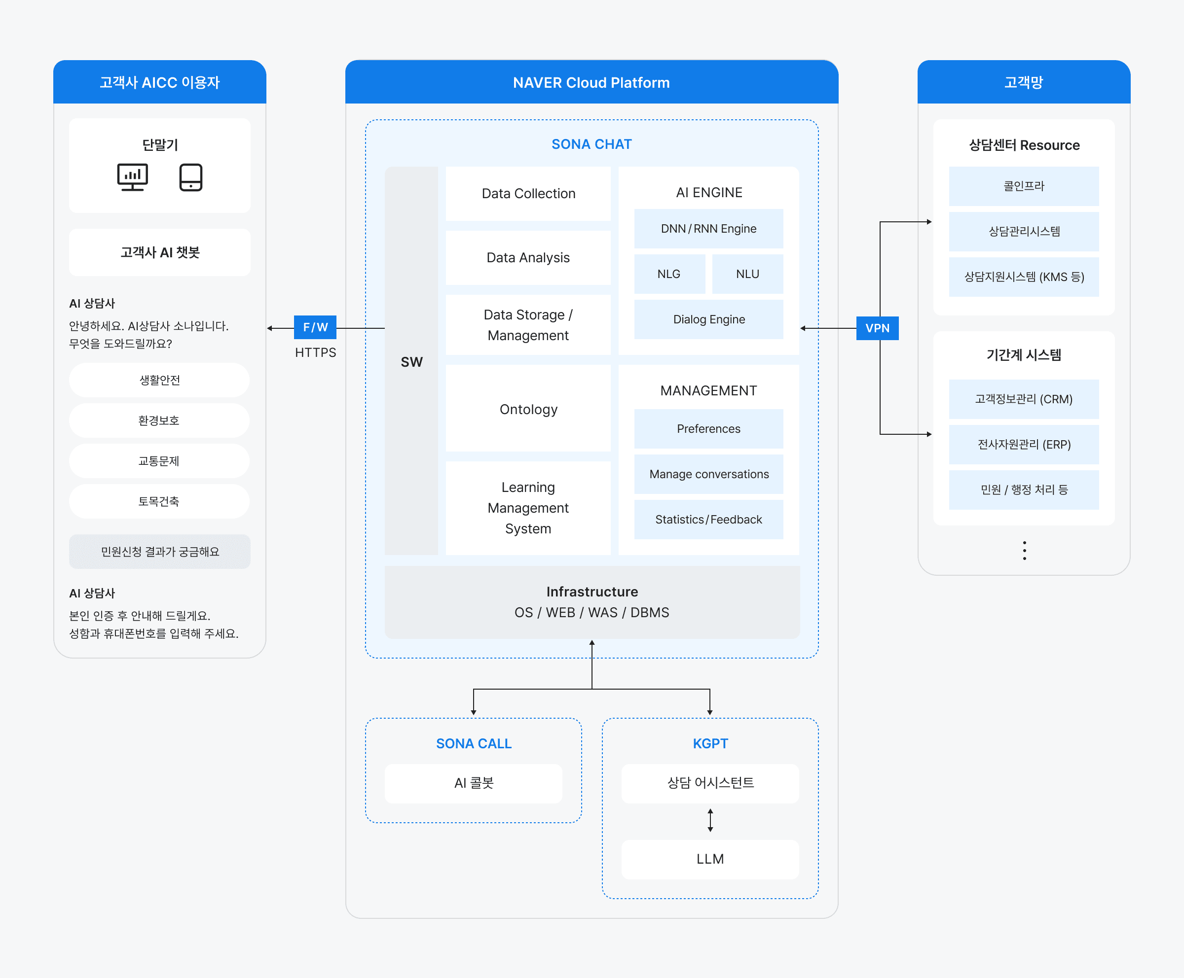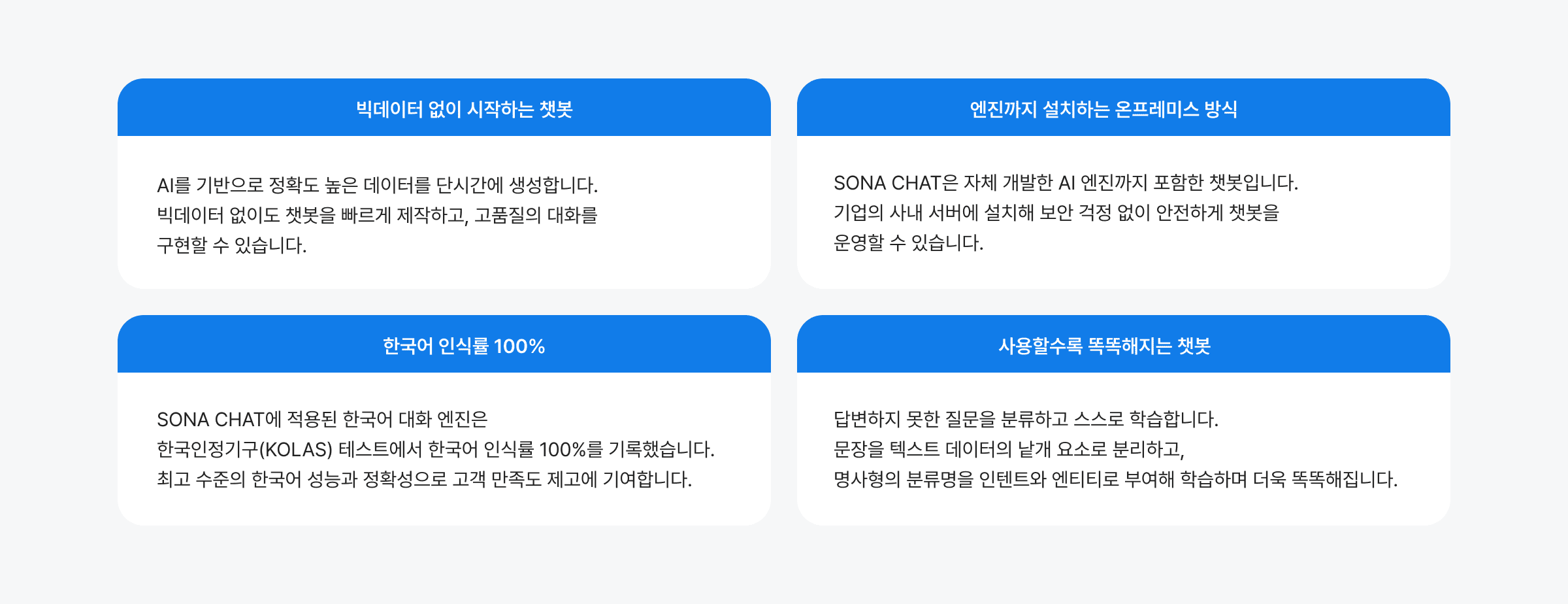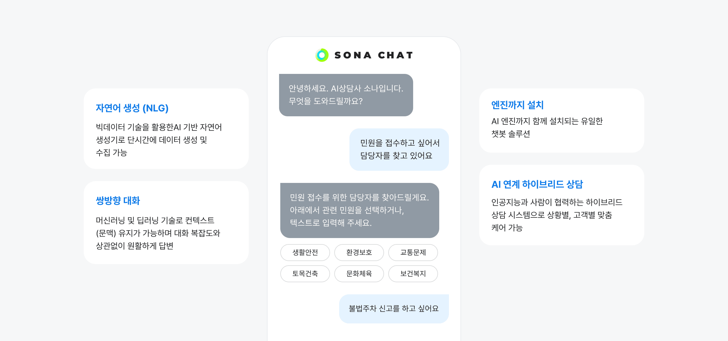 페르소나AI의 ‘SONA CHAT’은 대고객 상담 및 사내 인바운드 업무를 처리하는 차세대 AI 챗봇 솔루션입니다. AICC(인공지능컨택센터)의 기반이 되는 챗봇 도입을 통해 상담 대응에 소요되는 리소스는 절감하고, 고객 만족도는 향상할 수 있습니다. 금융권, 대기업, 공공기관에서 SONA CHAT을 도입해 93% 이상의 평균 응답률을 기록했습니다.