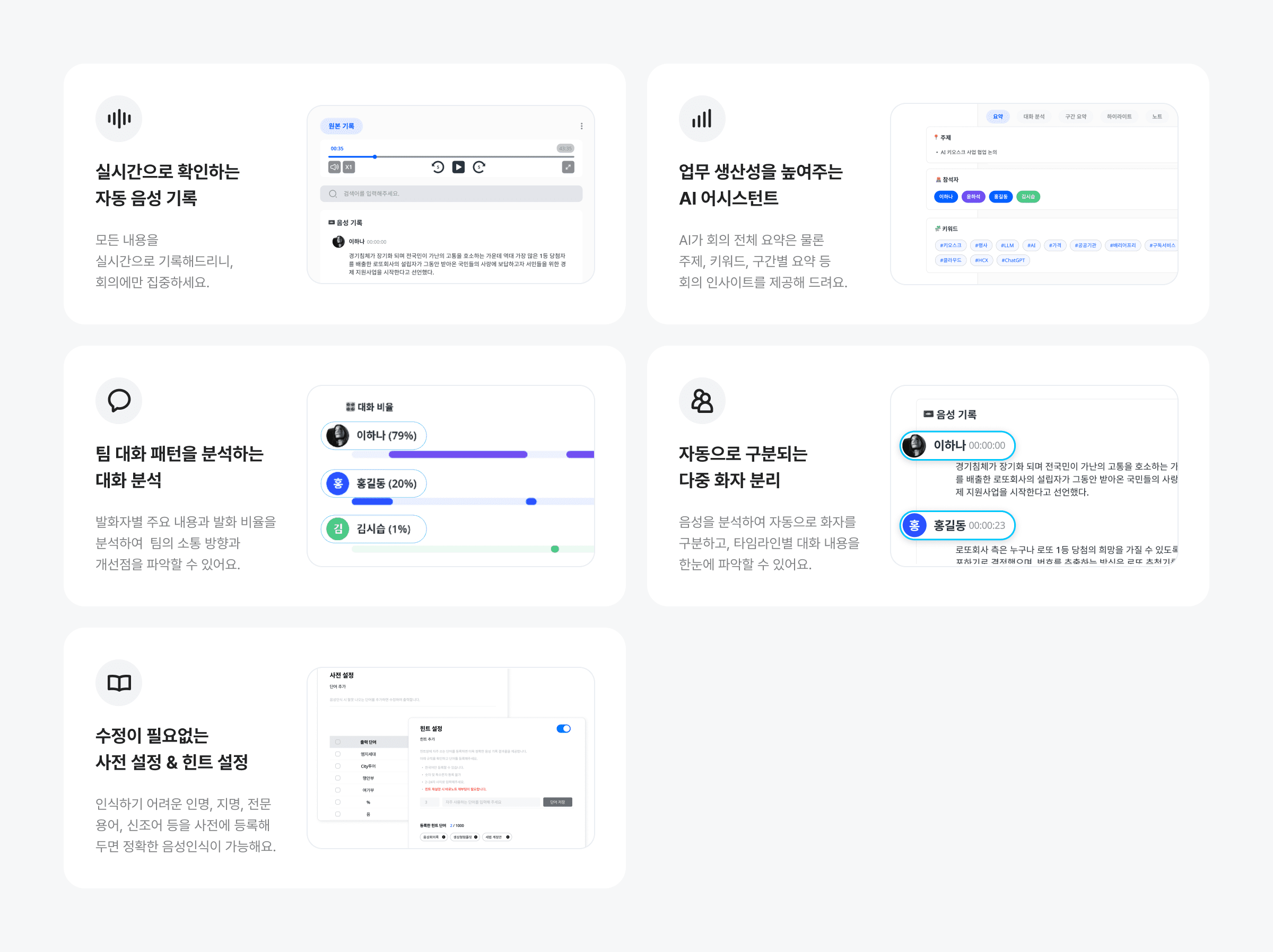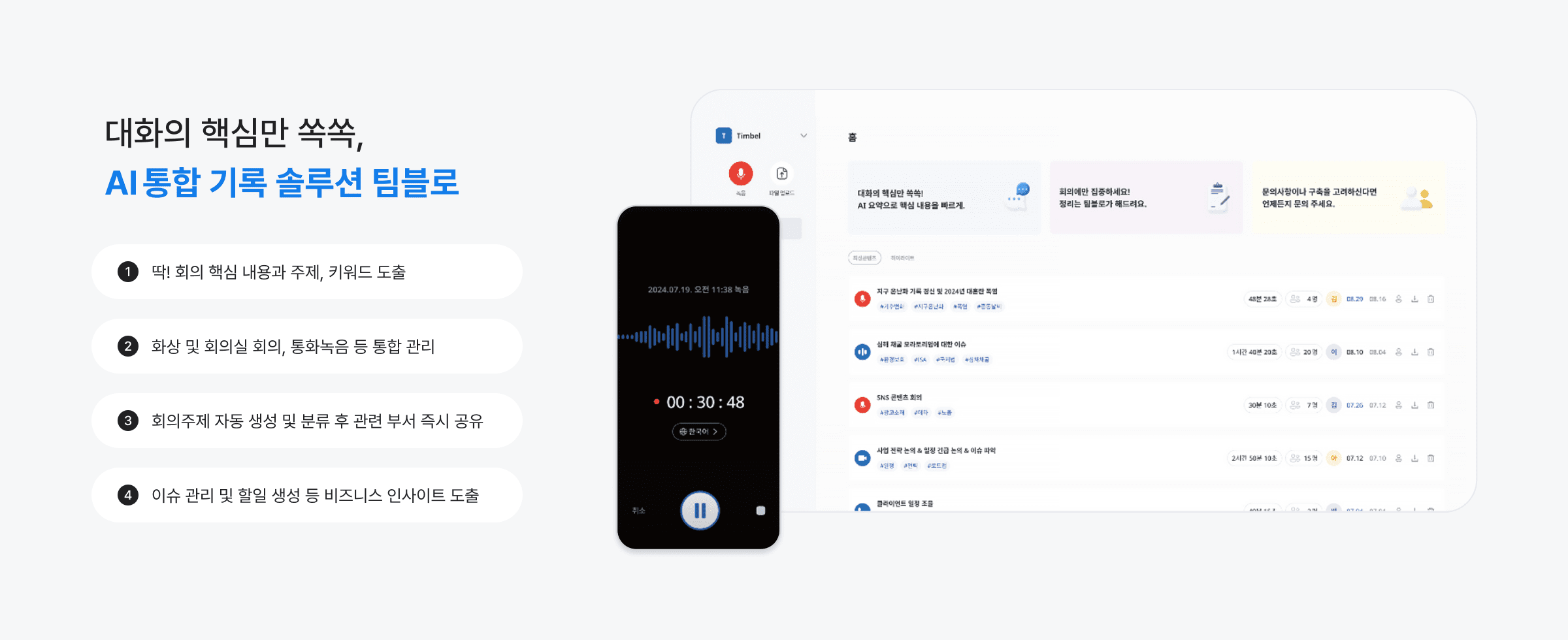 팀블로는 편리한 기록을 위해 실시간 음성인식부터 다중화자 구분, 핵심내용 요약, 키워드추출, 주제요약까지 한 번에 회의록이 완성되는 서비스입니다.