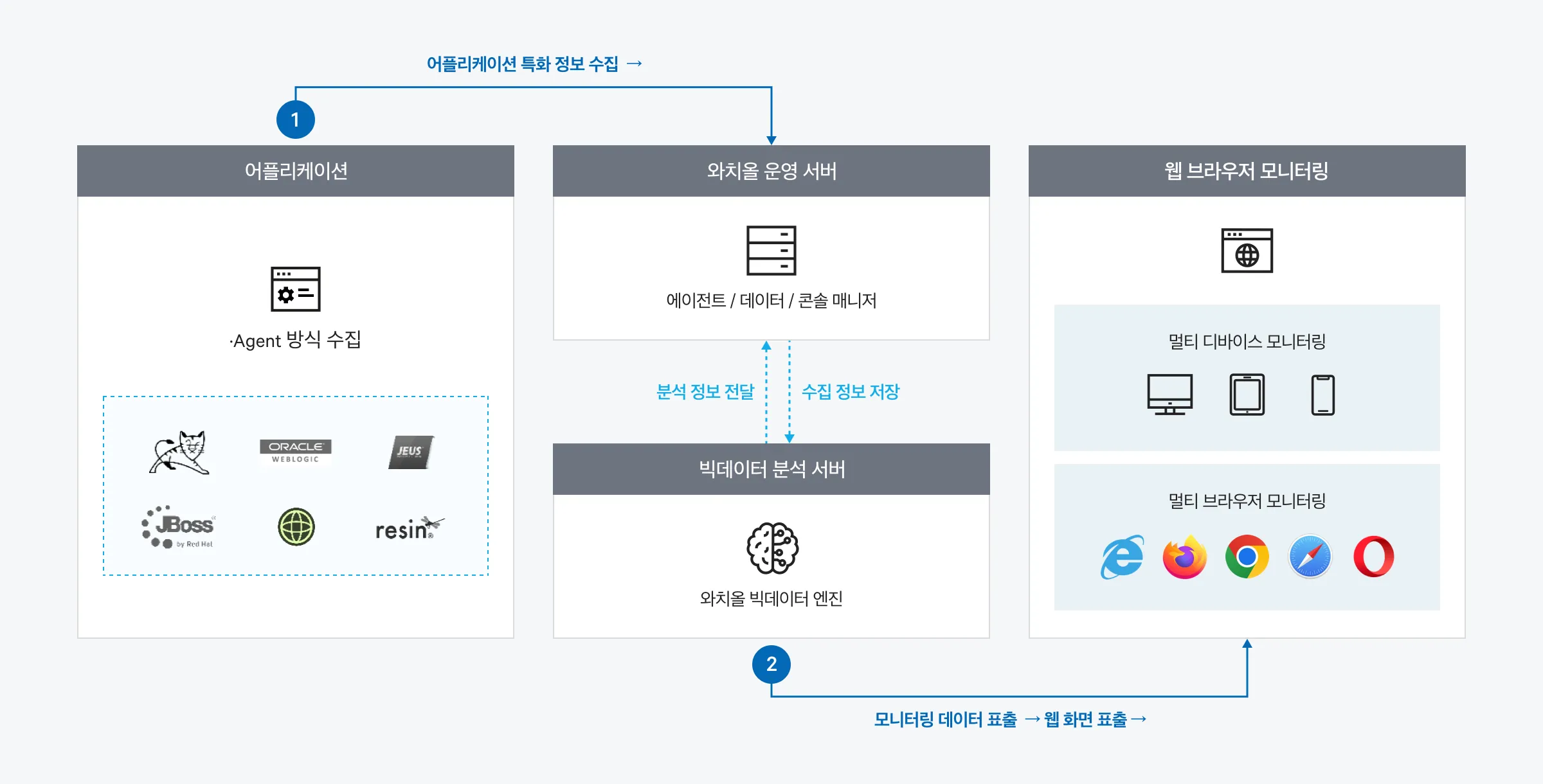 통합 모니터링 WAS(Tomcat, Jboss, WebLogic, JEUS 등)의 다양한 이기종 자원(서비스, JVM, CG, HOST 등)에 대한 통합 모니터링