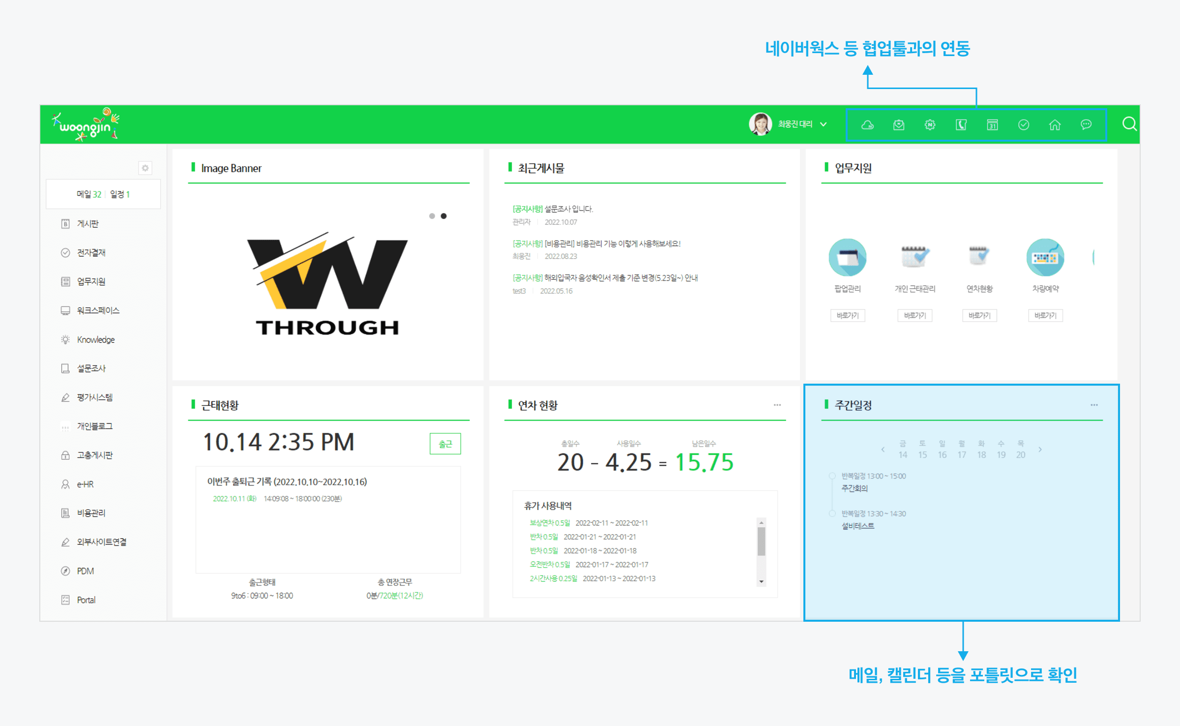 NAVER WORKS 등 협업툴과의 연동으로 포탈 화면에서 모든 협업 기능에 접근하여 업무 효율성을 높일 수 있습니다.