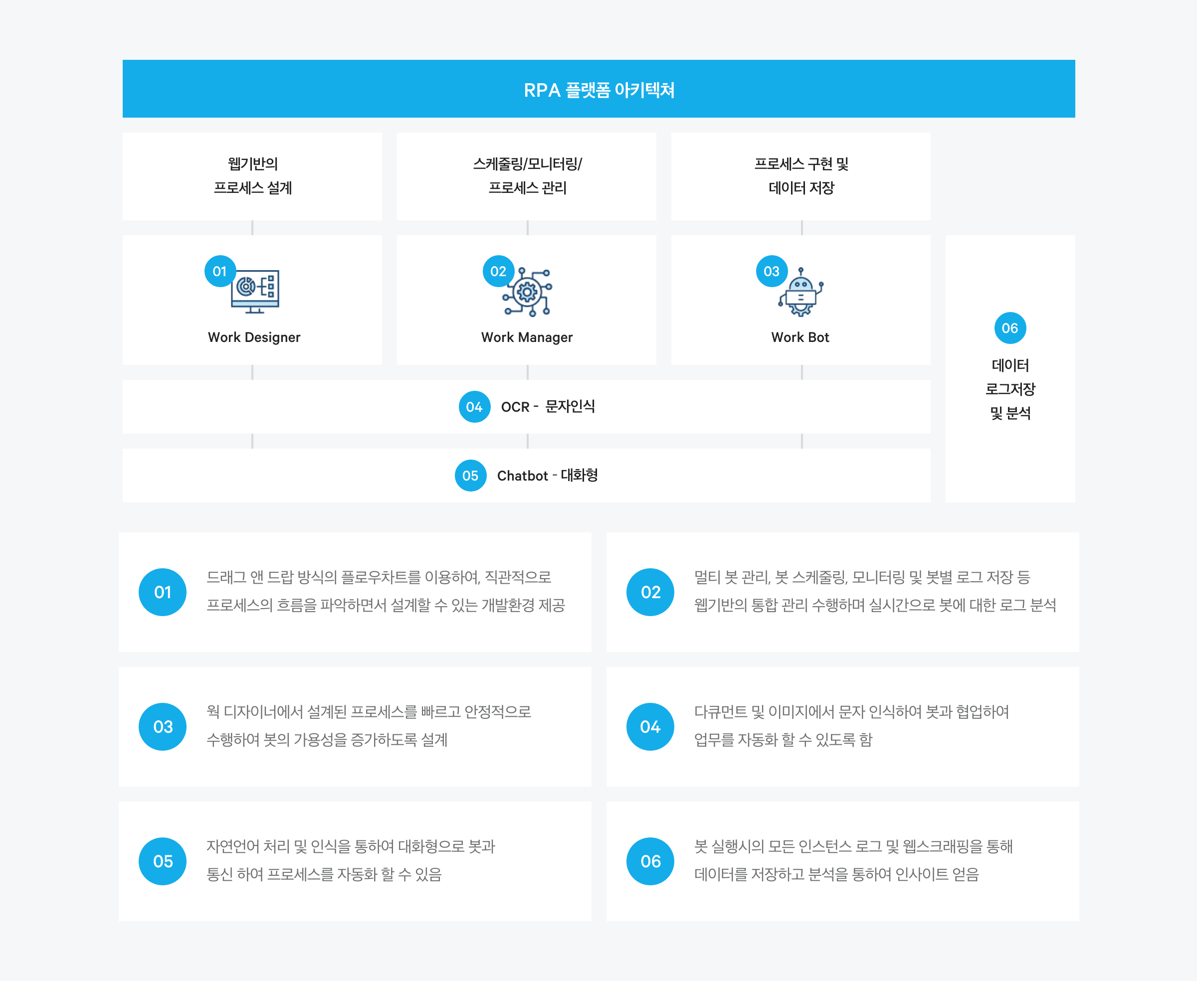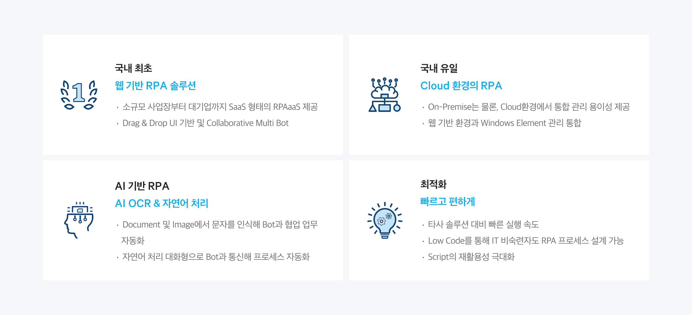 · 국내 IT 환경에 최적화되어, 외산 솔루션의 Bot 대비 짧은 프로세스 처리 시간 및 컴퓨팅 자원 소요량 최소화