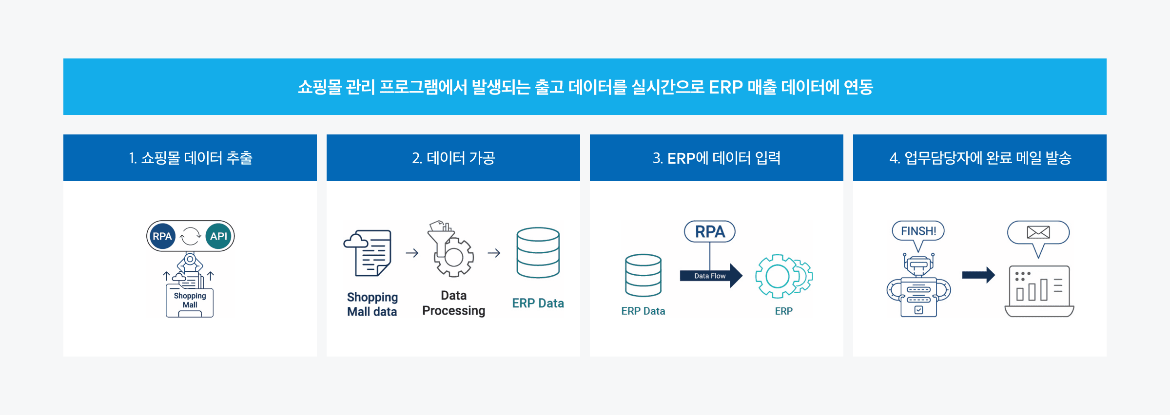 1. 제품 판매 데이터를 인적 개입 없이 RPA를 통해 자동으로 입력 → ERP상의 재무 데이터 정합성 및 실시간성 확보.