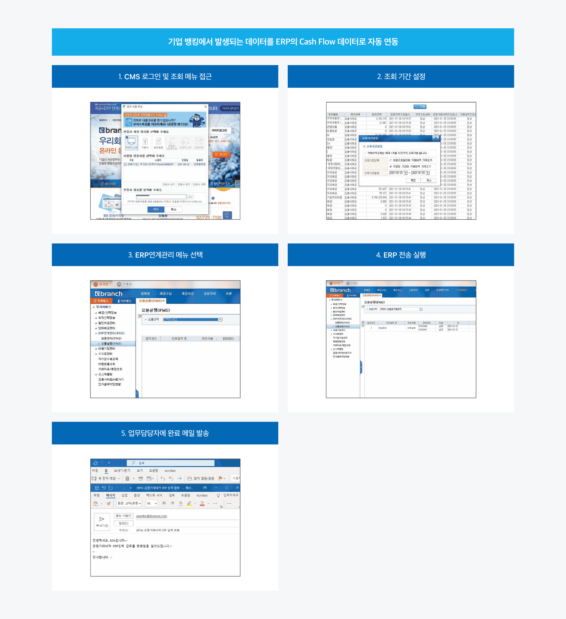 1. 기업 뱅킹에서 발생되는 데이터를 ERP의 Cash Flow 데이터로 자동 연동 → ERP상의 재무 데이터 정합성 및 실시간성 확보.