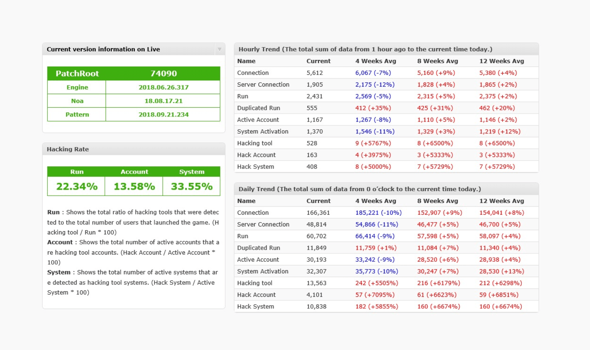 모든 제품에 대해 모니터링 시스템 (WCS) 제공합니다. 해당 시스템은 더 이상 프로그램을 따로 설치하지 않고도 http://www.xigncode.net에 접속하면 쉽게 접근할 수 있습니다. 솔루션과 관련된 모든 작업은 이 시스템을 통해 수행할 수 있습니다. 해당 사이트를 통해 일, , , 분기에 따른 통계 테이터 및 해킹 정보를 확인 가능합니다.