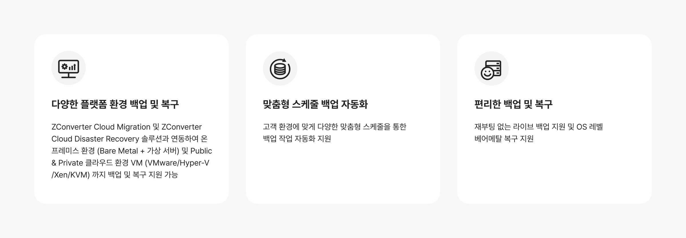 ZConverter Cloud Backup 솔루션은 시스템 이미지 백업 기술을 이용하여 윈도우/리눅스 서버 운영체제/데이터 백업 및 복구를 지원합니다. 랜섬웨어로 대표되는 사이버 테러 또는 서버 장애 발생시 재설치 작업 없이 신속하게 복구하는 솔루션입니다.