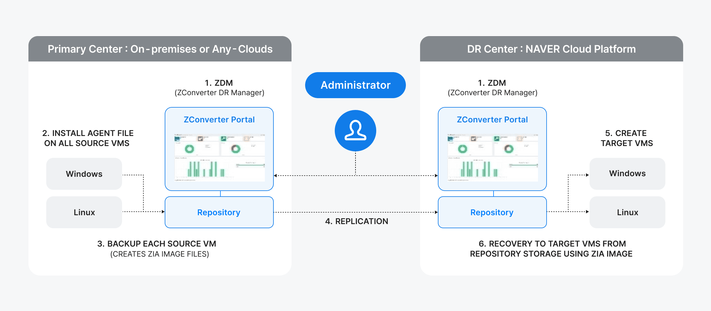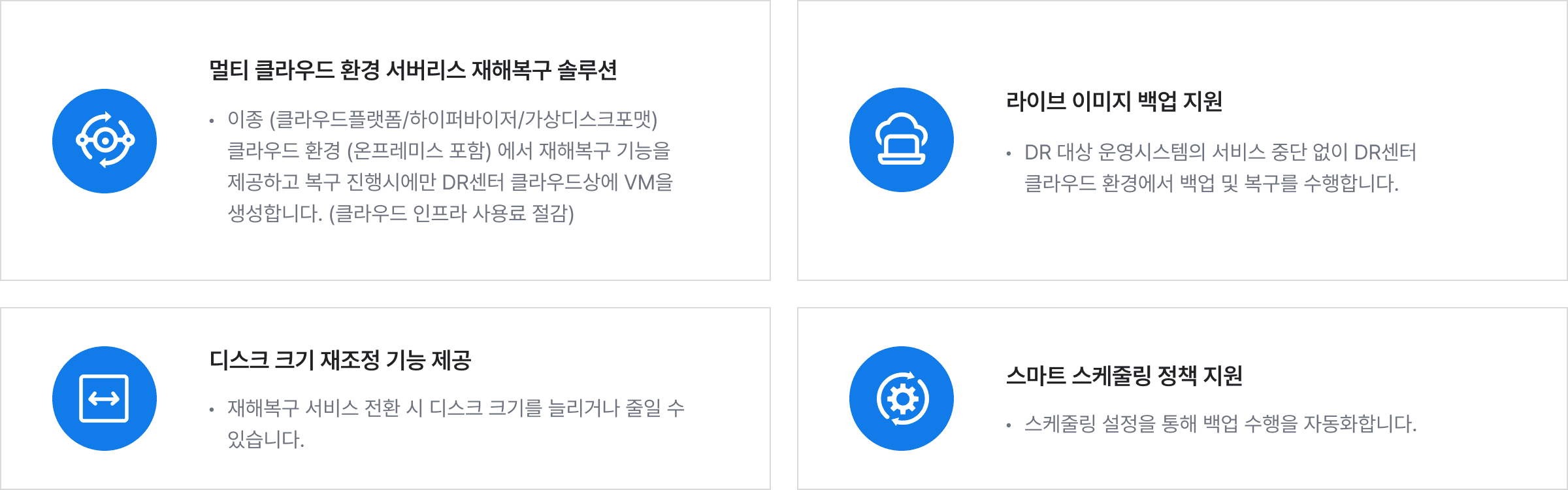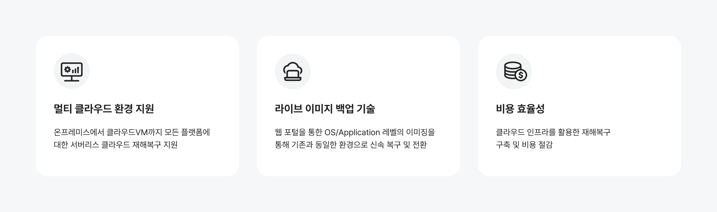 온프레미스 환경 서버 및 이종 클라우드 환경 VM 재해 상황 발생시 DR센터 클라우드 환경으로 OS/APP 재설치 없이 복구 전환하여 고객의 기존 운영환경과 동일한 구성으로 신속 재운영할 수 있도록 지원하는 서버리스 클라우드 재해복구 솔루션입니다.