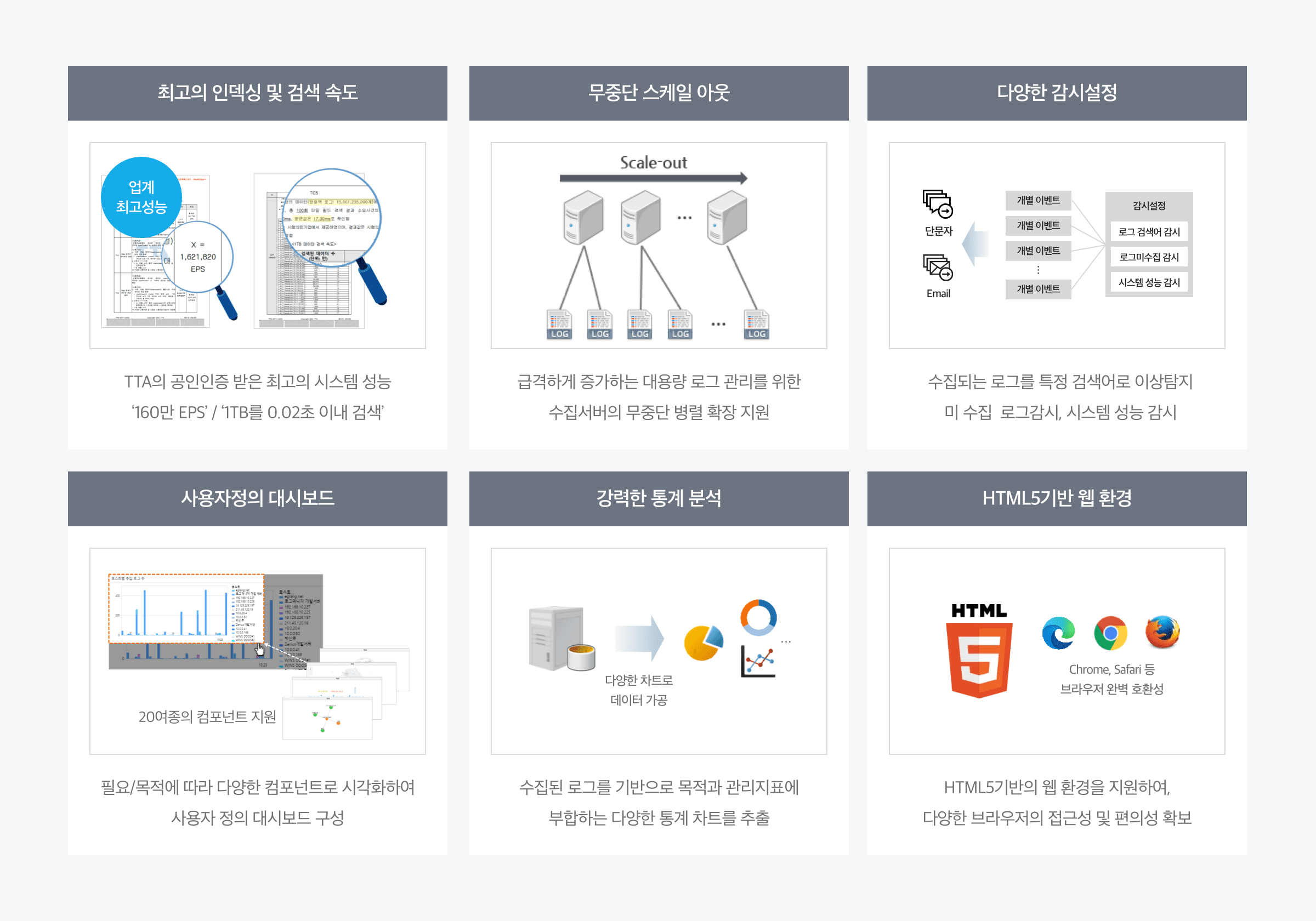 독보적인 인덱싱 및 검색속도를 제공하며, 확장성, 편의성, 효율성, 호환성 등의 특징 및 장점을 보유한 제품입니다.