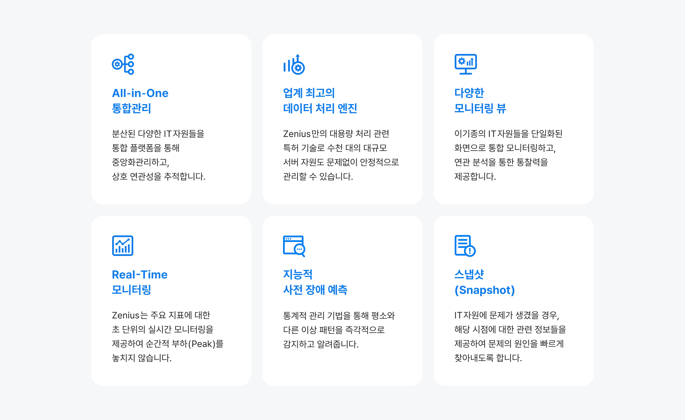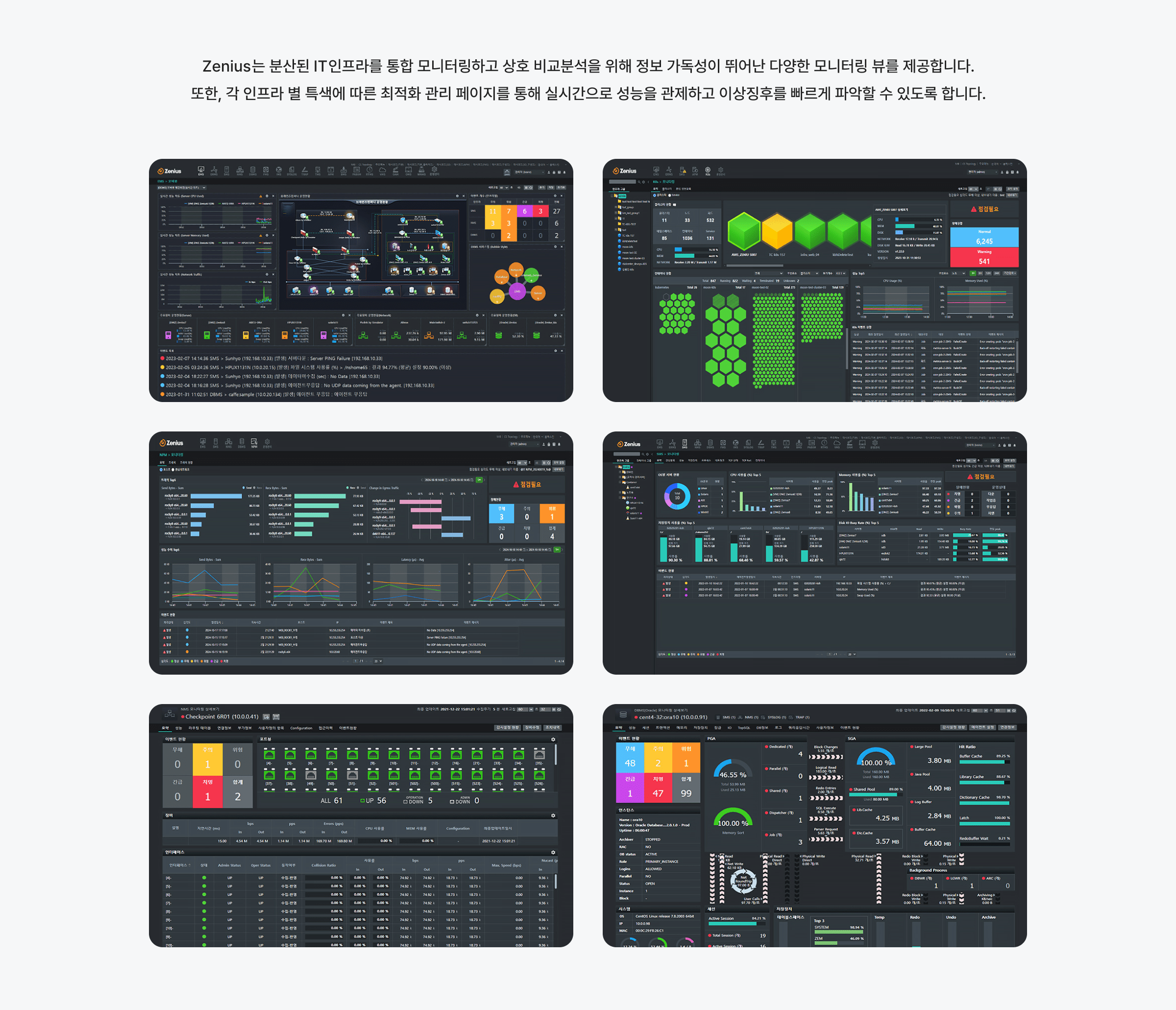 Zenius만의 대용량 정보 처리 기술과 자동화된 이상 징후 감지 기능을 통해 고객의 IT자원을 안정적이고 효율적으로 운영할 수 있도록 합니다.