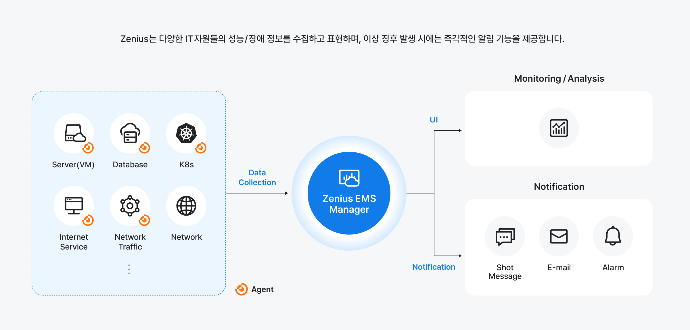 Zenius-EMS는 서버관리, 네트워크관리, 데이터베이스관리, 쿠버네티스관리, 네트워크성능관리, 인터넷서비스 관리 기능을 제공하며, 포인트 솔루션 구성에 따라 기능을 선택적으로 활용할 수 있습니다.