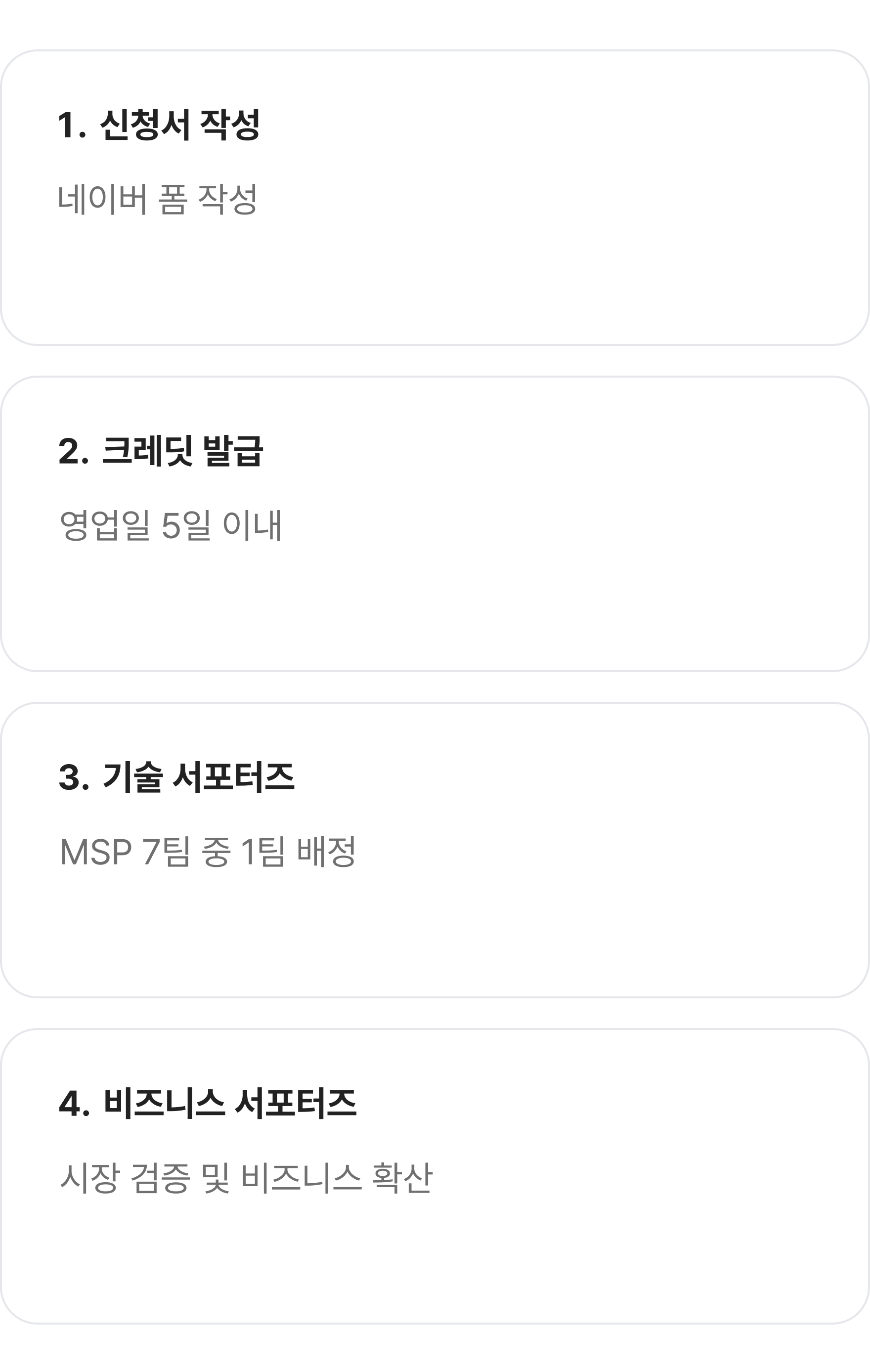 인프라 아키텍처 최적화, 보안 컨설팅, 빌링 최적화 등을 위해 MSP 파트너를 소개드립니다. 기술 서포터즈를 통해 추가 크레딧 발급 문의도 가능하며, 클라우드를 사용하기 위한 전반적인 문의를 하실 수 있습니다. 그린하우스 크레딧 발급 이후 자동 배정되며 배정 이후 연락 받으실 수 있습니다